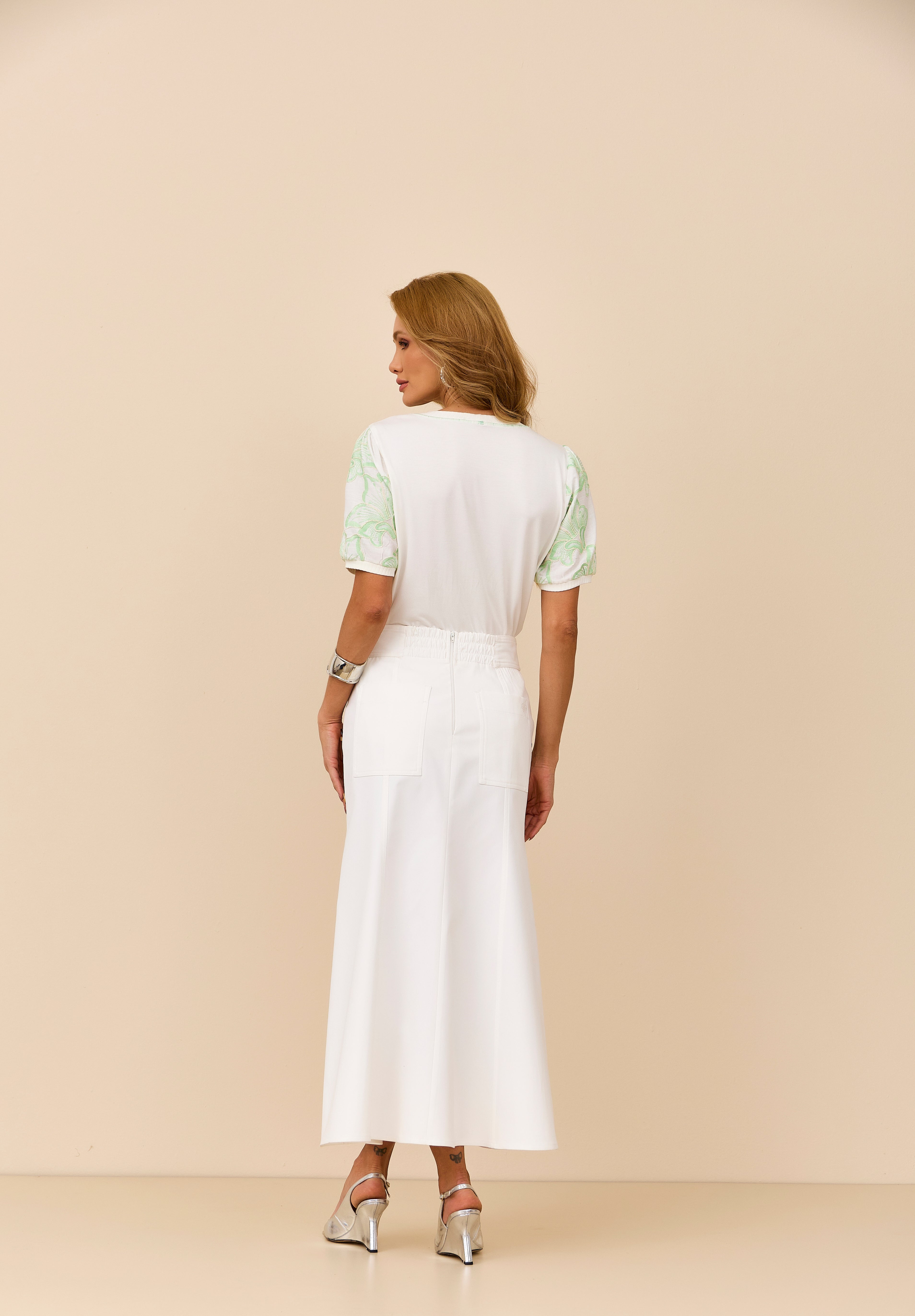 Blusa off white de mangas curtas com delicados bordados em tom de verde nas mangas. Uma peça charmosa e leve, que traz um toque artesanal e elegante ao look.