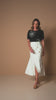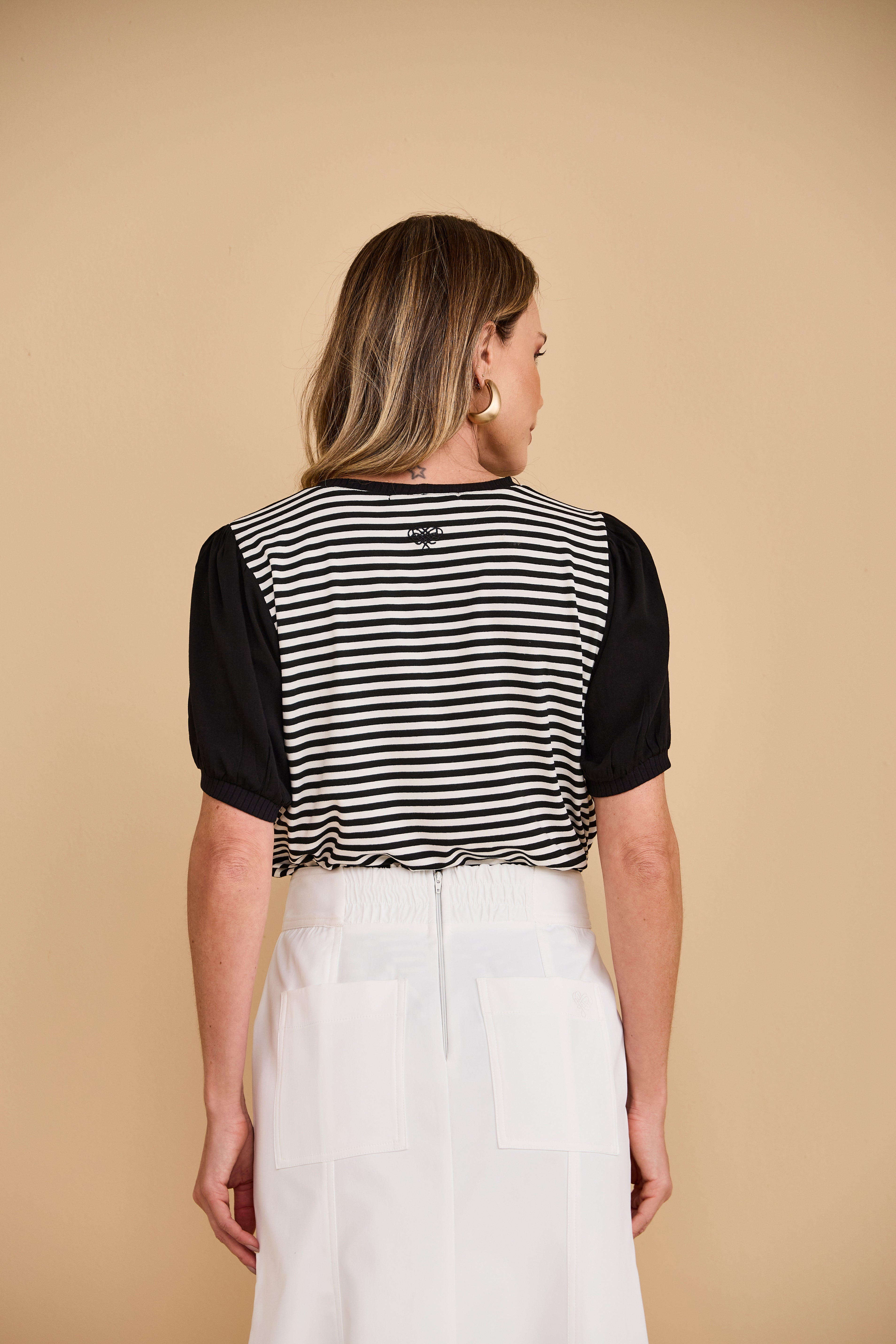 Blusa de mangas curtas com a frente preta e as costas em listrado preto e branco. Na frente, o destaque fica por conta da aplicação de uma flor feita com o próprio tecido listrado, criando um contraste moderno e elegante.