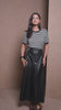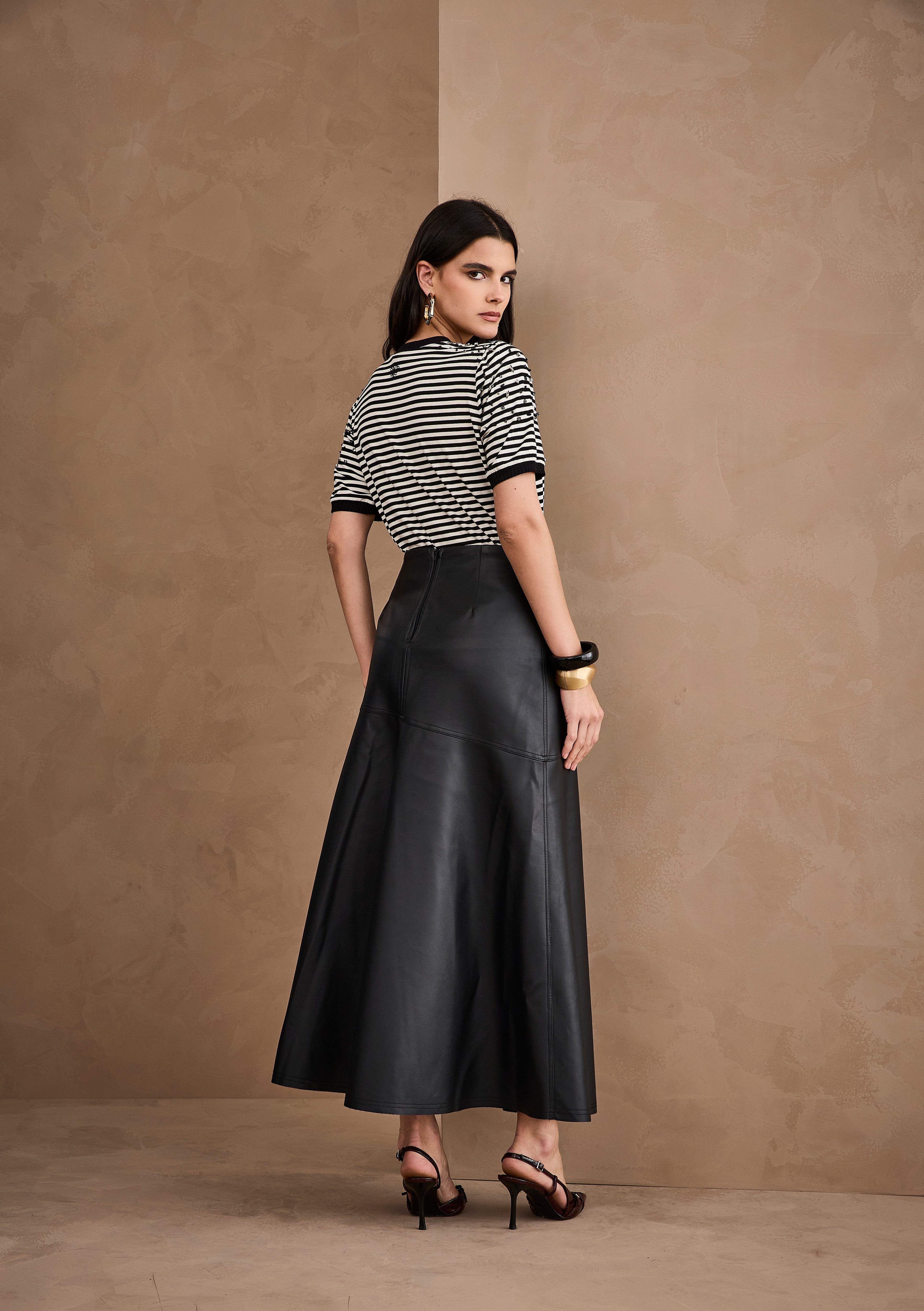 Blusa de mangas curtas listrada em preto e off white, com punhos em preto que trazem contraste e sofisticação. Possui aplicação de pedrarias delicadas na parte frontal, acrescentando um toque elegante e feminino ao visual.
