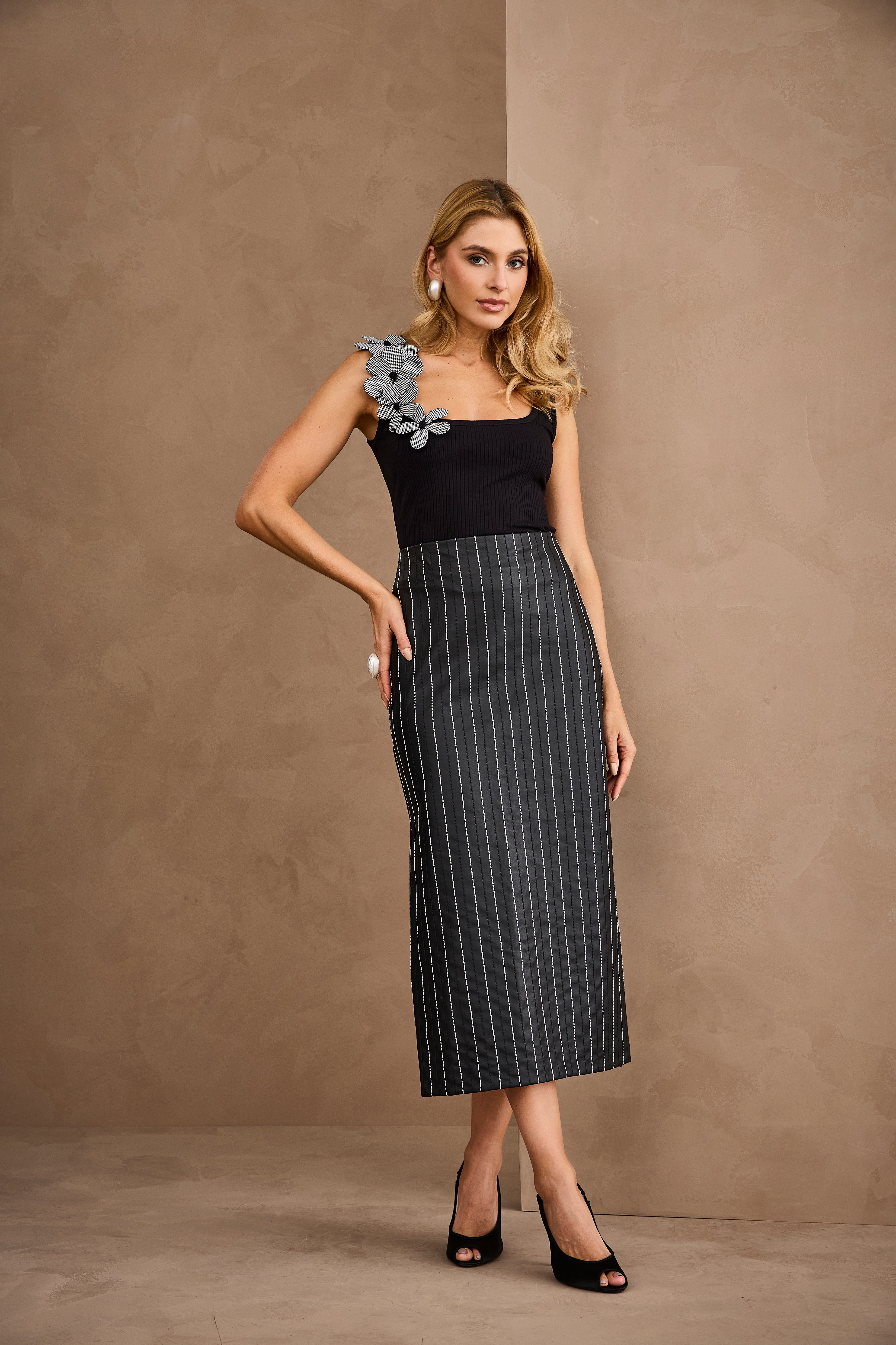 Blusa de alças preta em canelado power, com modelagem que valoriza a silhueta e garante um caimento impecável. O destaque fica por conta da aplicação de flores em tecido em uma das alças, trazendo charme e um toque delicado que transforma a peça em um item elegante e cheio de personalidade.