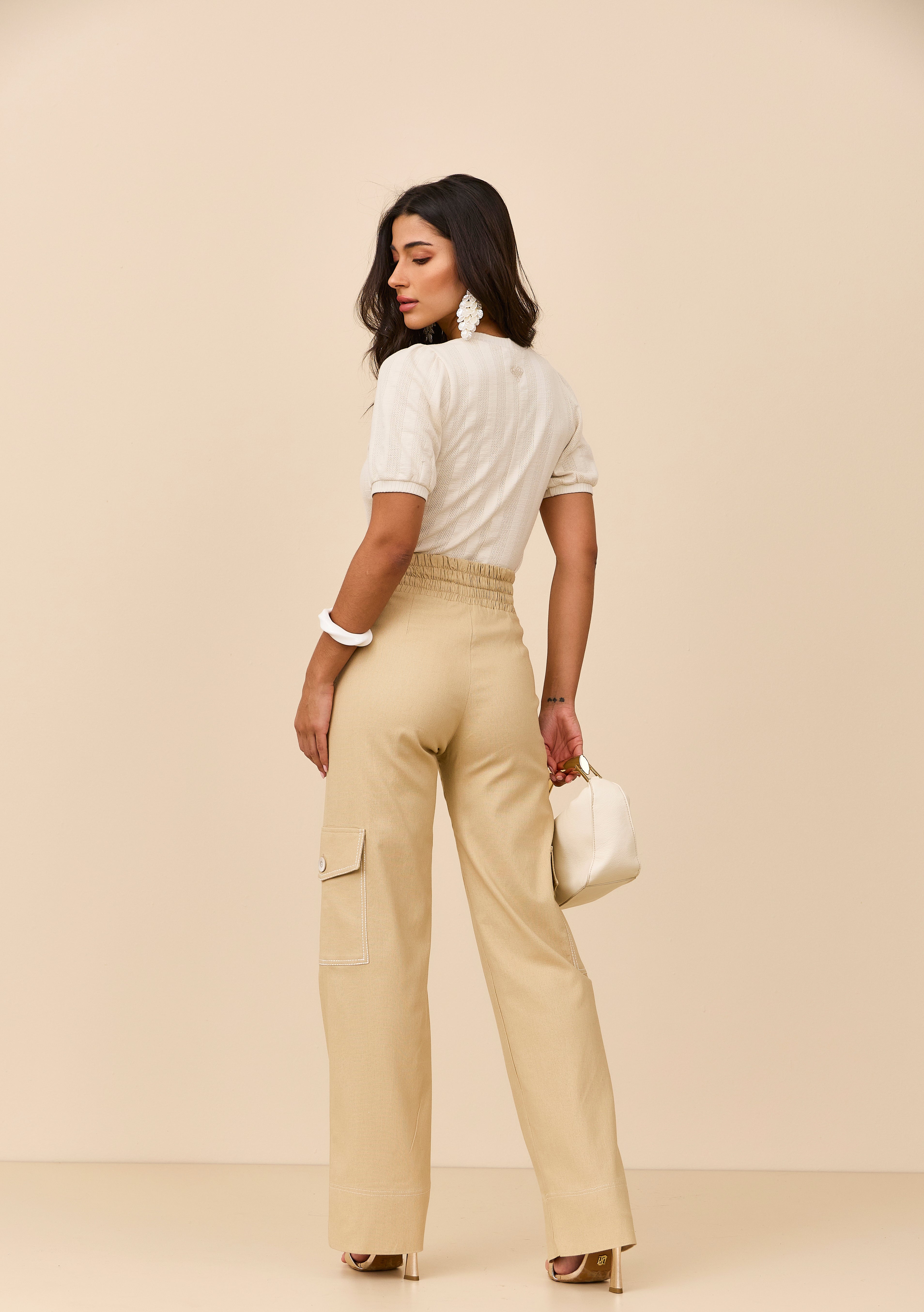 Blusa bege em tecido tricô super comfy, com mangas curtas e delicadas aplicações de flores que trazem charme e feminilidade à peça. Um modelo aconchegante, moderno e cheio de estilo.