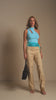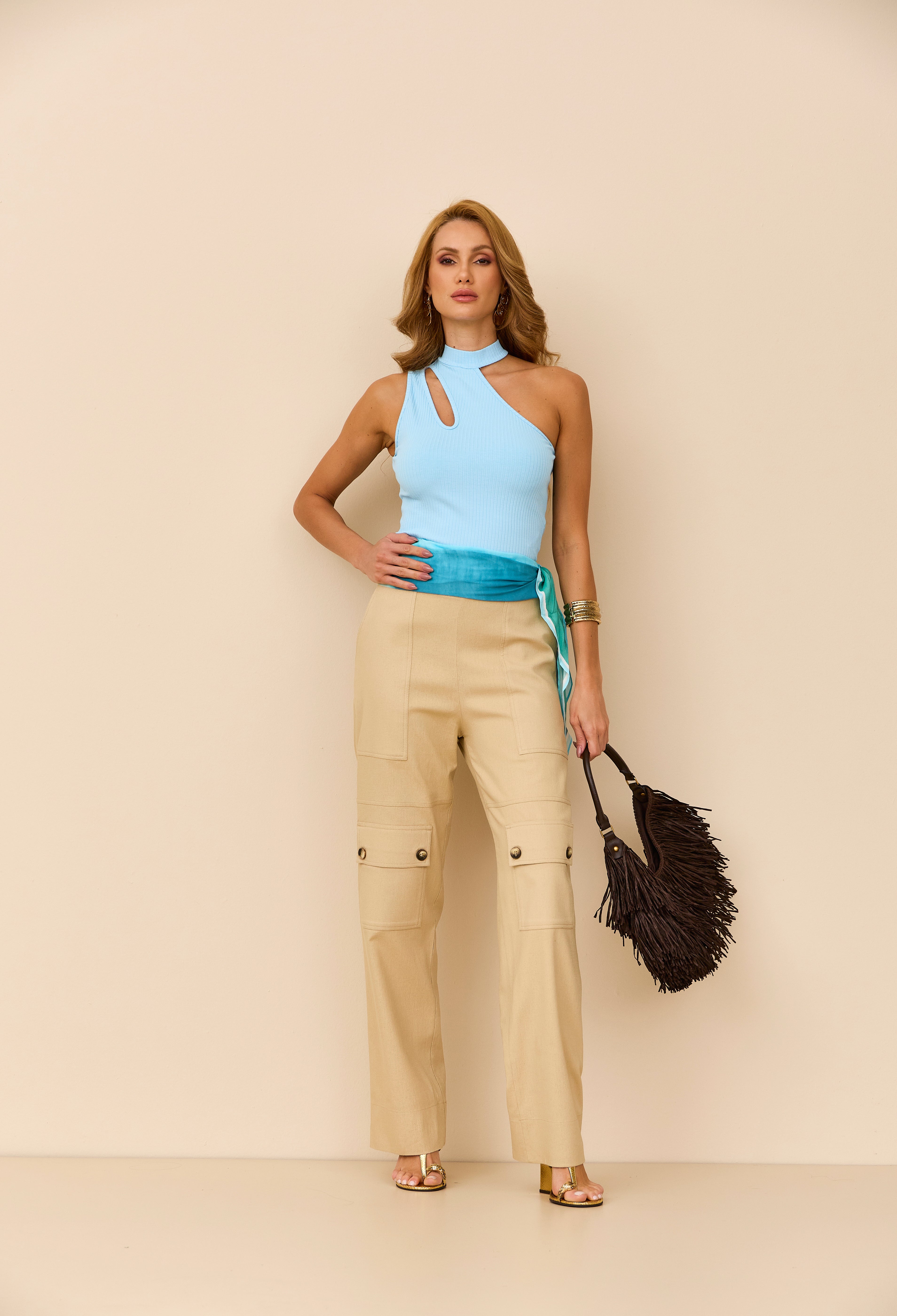 Calça Nicoly em linho bege, com modelagem moderna e bolsos frontais que trazem praticidade e estilo. Uma peça super estilosa e versátil, perfeita para composições elegantes e atemporais.
