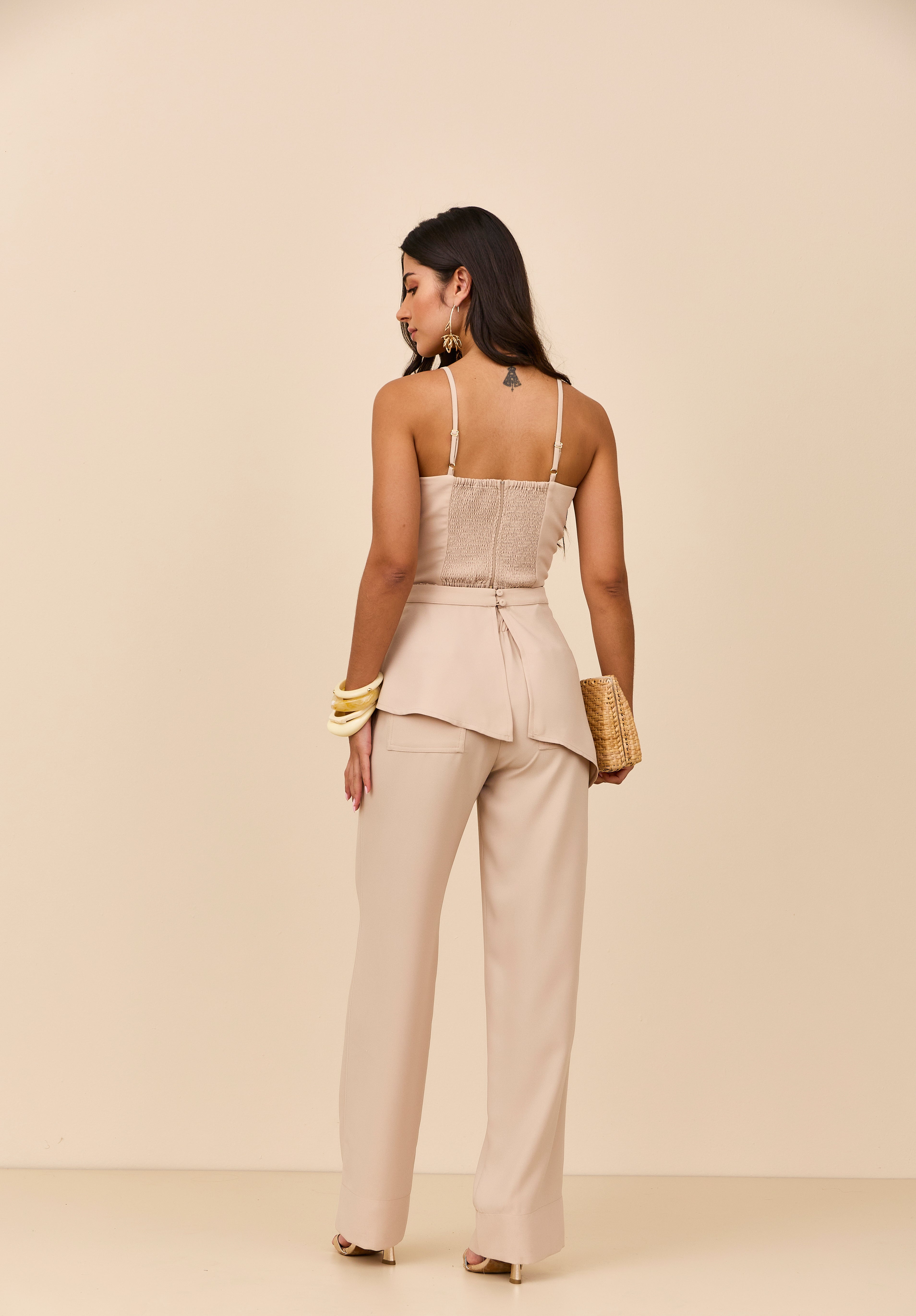 Conjunto bege sofisticado que une elegância e versatilidade em uma única peça. O top, moderno e refinado, conta com um peplum removível, permitindo dois looks incríveis em um só — para ocasiões que pedem desde um estilo mais clean até um toque extra de charme. As alças são adornadas com pedrarias delicadas, conferindo um brilho sutil e sofisticado. A calça, de corte impecável, completa o visual com elegância e conforto, ideal para quem valoriza estilo e praticidade.