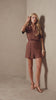 Conjunto em tom terroso composto por camisa de mangas curtas e short, que une elegância e um toque contemporâneo em cada detalhe. A camisa apresenta gola clássica e decote com amarração em cordões, criando um visual moderno e sofisticado, além de acabamento impecável. O short de modelagem estruturada valoriza a silhueta com conforto, trazendo bolsos frontais e detalhes pespontados que reforçam o cuidado e a riqueza da peça. Um conjunto versátil e cheio de estilo, perfeito para composições elegantes com um ar atual e descomplicado.