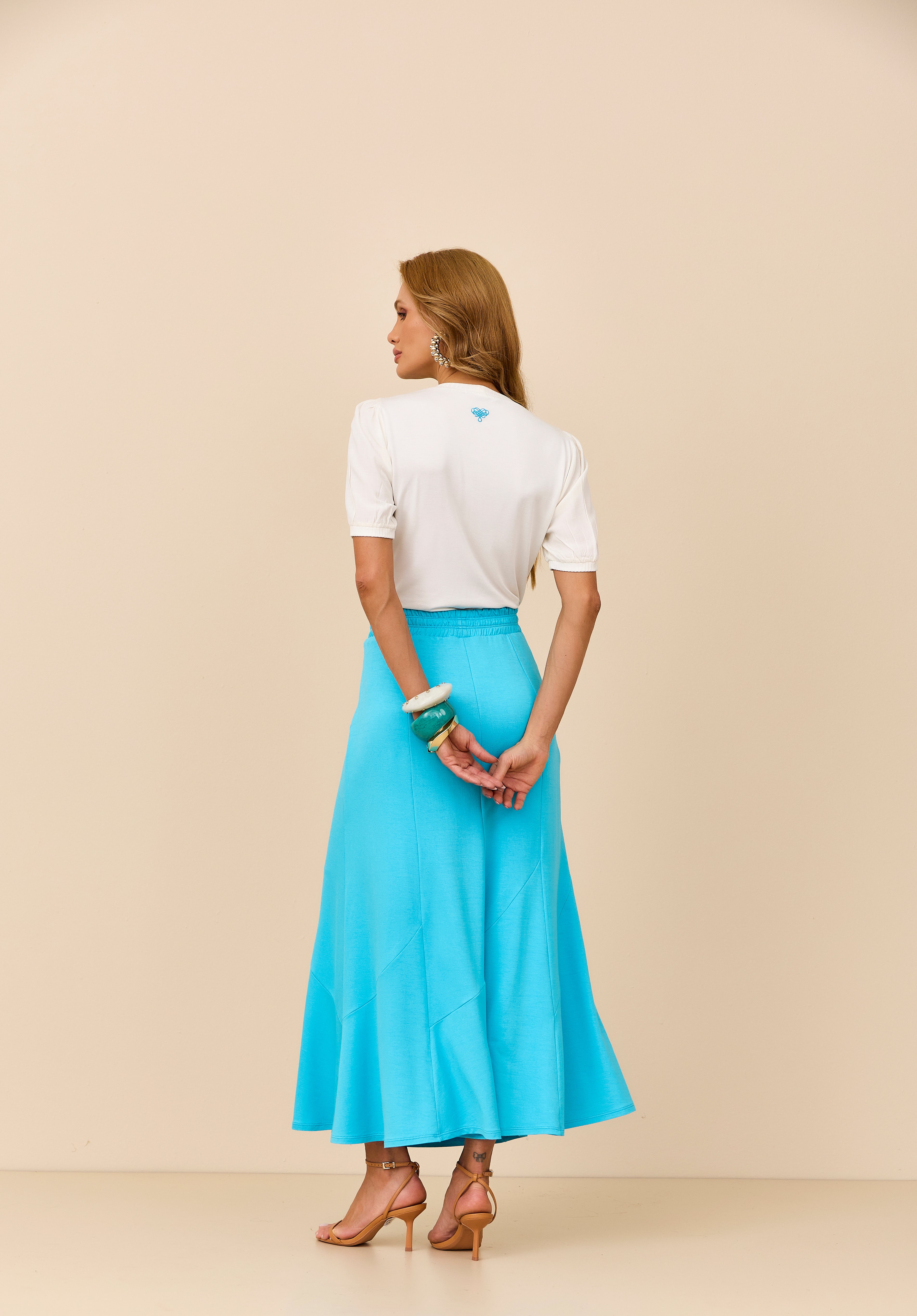 Conjunto de saia midi azul em moletom super leve — confortável sem perder a elegância — combinado à blusa off white com delicadas aplicações de flores em crochê no tom da saia. Um look que une o melhor do comfy com um toque chique e artesanal, perfeito para quem busca estilo com suavidade.