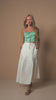 Conjunto super elegante com a identidade Artsy em cada detalhe. O top traz estampa exclusiva da marca, com fundo off e desenho em verde, criando um visual moderno e sofisticado. As alças possuem ponteiras de madeira, que adicionam um charme natural e diferenciado. A saia midi off completa o look com pespontos verdes que dialogam perfeitamente com o top, criando uma combinação harmônica, chique e cheia de personalidade. Uma produção impecável para quem ama estilo com assinatura própria.