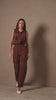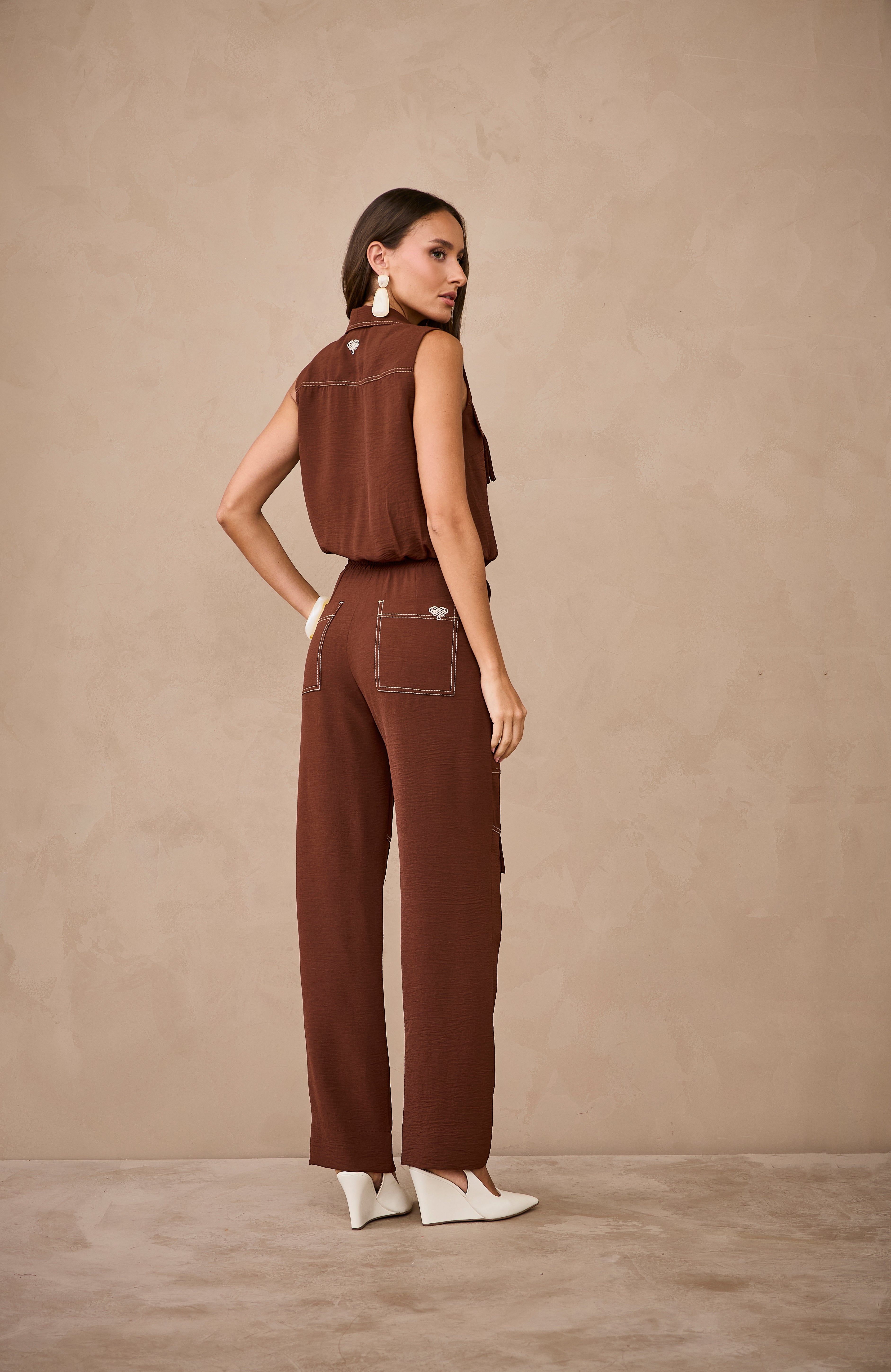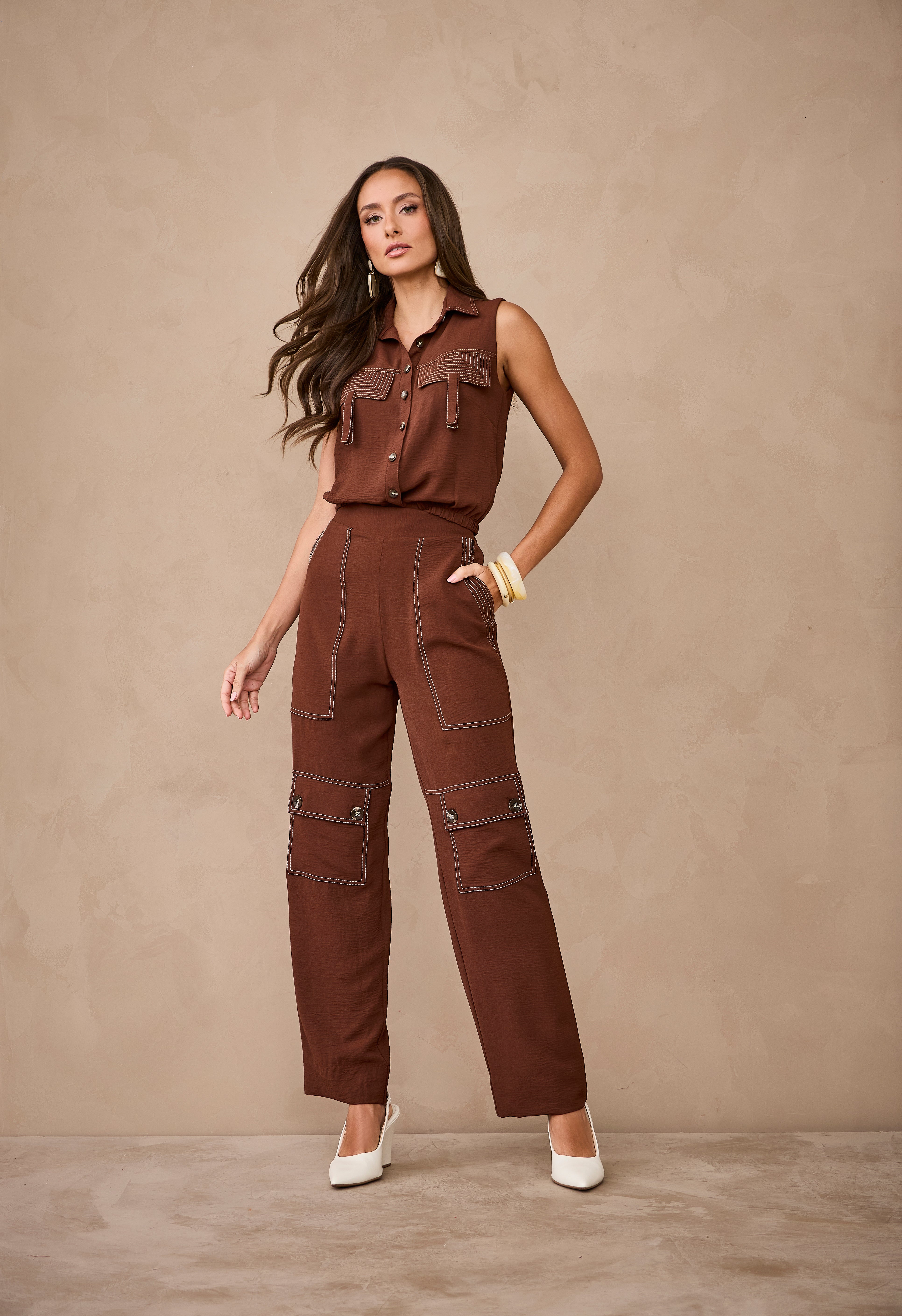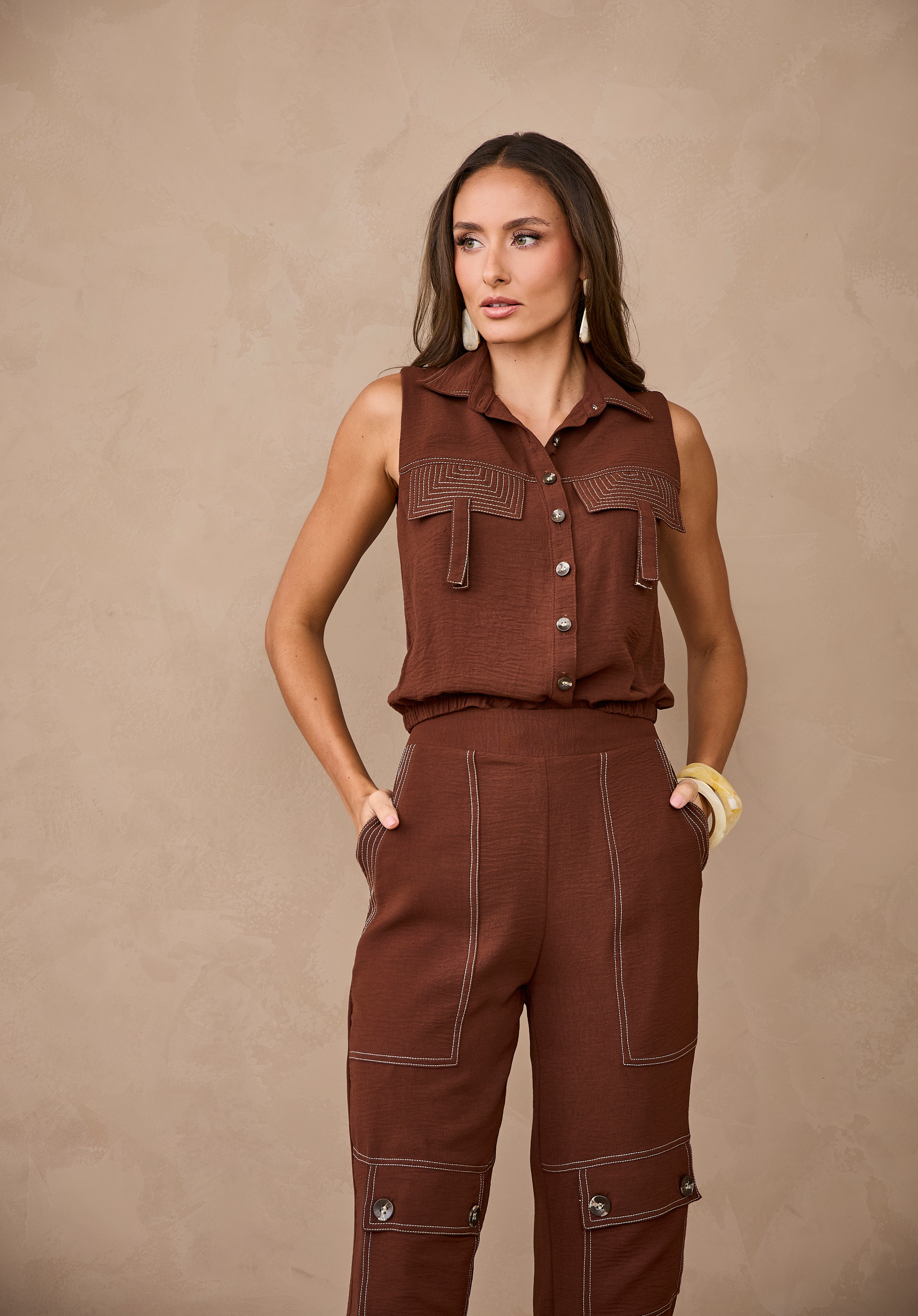 Conjunto em tom terroso composto por blusa sem mangas com gola clássica e fechamento frontal por botões, trazendo um toque sofisticado e moderno. Possui detalhes em pespontos aparentes e bolsos utilitários que valorizam o design. Acompanha calça de modelagem reta com bolsos cargos e acabamento estruturado, criando um look contemporâneo, elegante e cheio de estilo.