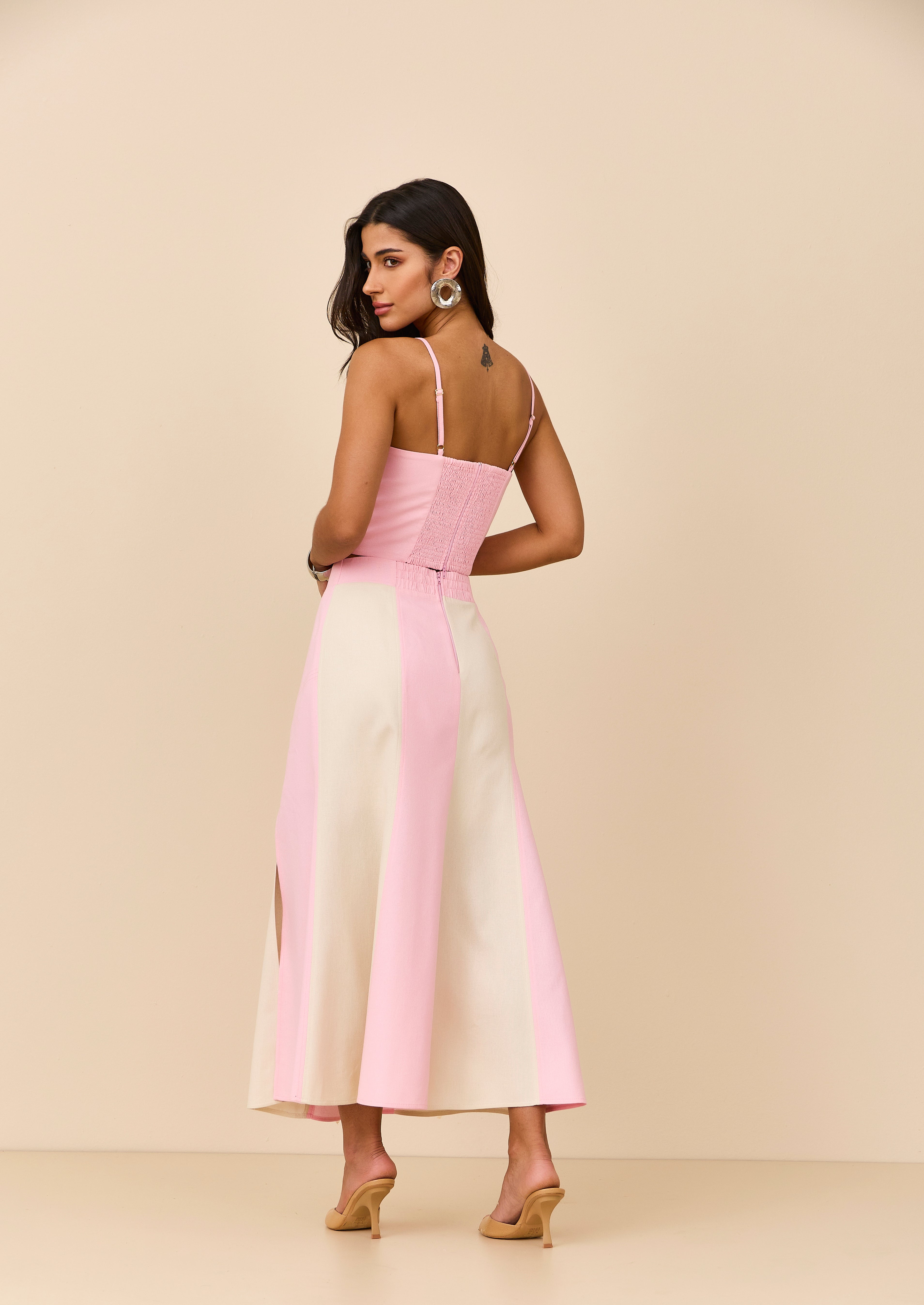 Conjunto composto por saia midi com recortes em rosa e off white, criando um visual delicado e harmonioso, e top rosa com aplicações de flores de crochê que adicionam charme artesanal à peça. Um look feminino, leve e super delicado.