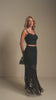 Conjunto preto maravilhoso, composto por top de alças elegante e saia longa com detalhes em renda e franjas, que acrescentam movimento, sofisticação e um charme único. Um look impactante e super chique.