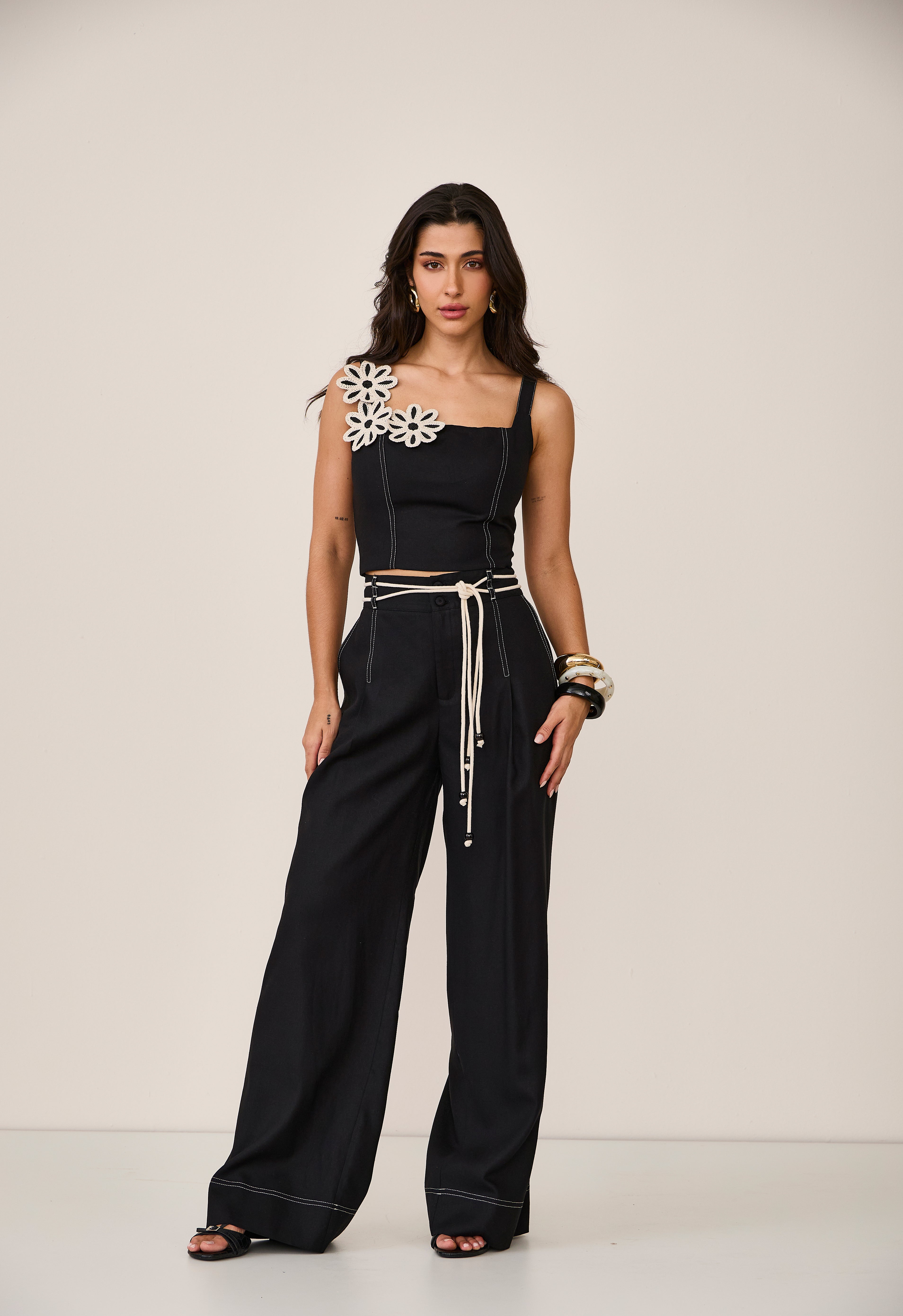 Conjunto Emanuela — sofisticado e moderno, o look combina top de alças com delicada aplicação de flores, trazendo um toque feminino e elegante. E a calça de caimento impecável e cinto com ponteiras, que completa a produção com charme e estilo. Uma composição versátil, perfeita para destacar-se com elegância em qualquer ocasião.