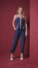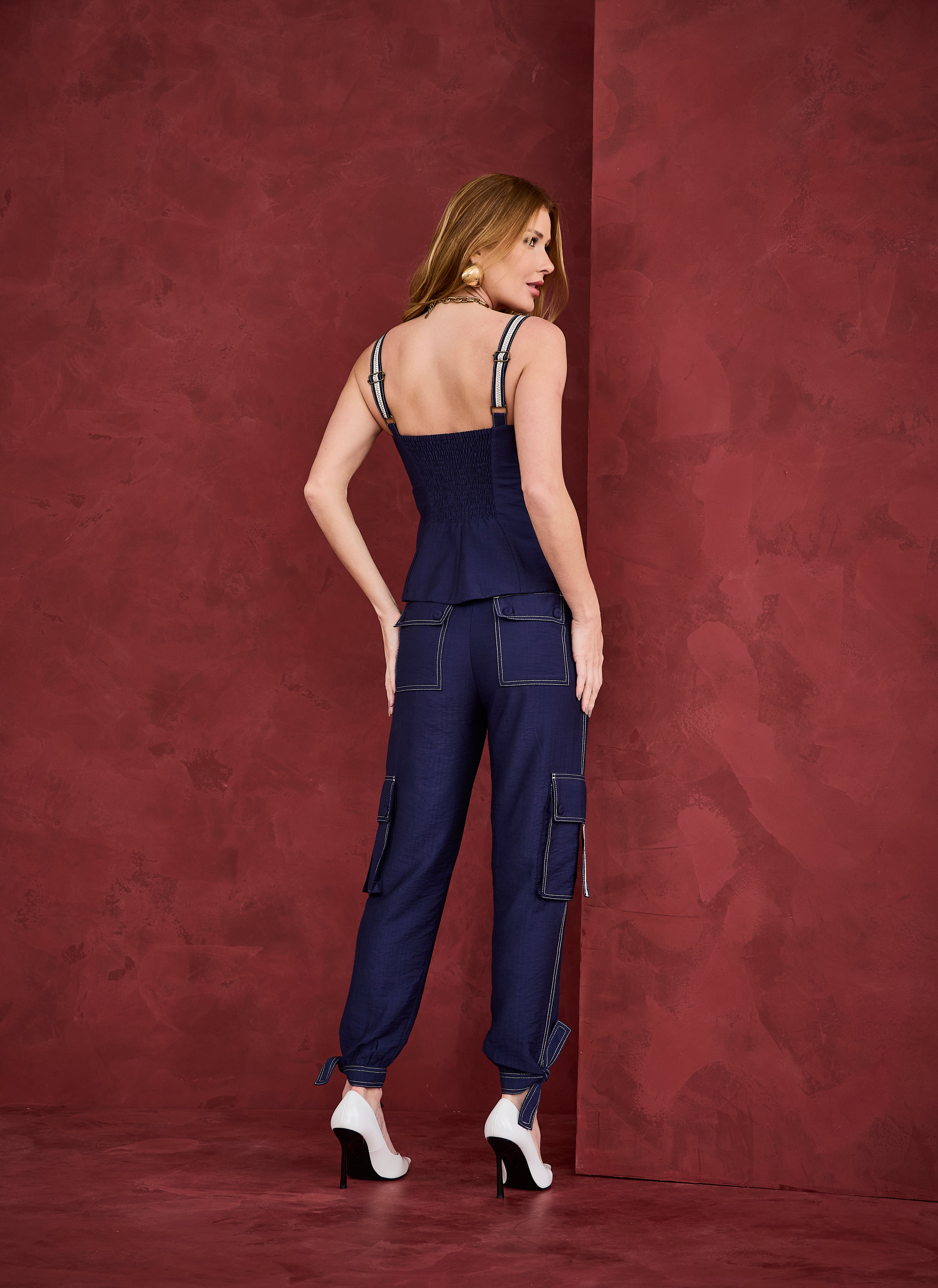 Conjunto em tom azul que une modernidade e sofisticação em um design marcante. A blusa de alças apresenta modelagem estruturada com fechamento frontal por zíper, valorizando a silhueta, além dos bolsos utilitários que trazem um toque contemporâneo. A calça complementa o look com caimento impecável e detalhes utilitários, como bolsos laterais e acabamentos em contraste que enriquecem a peça. Um conjunto elegante e cheio de personalidade, perfeito para produções atuais e estilosas.