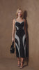 Conjunto composto por top de alças com modelagem estruturada que valoriza o busto, trazendo recortes em contraste que desenham a silhueta com elegância. Acompanha saia midi de caimento ajustado, com detalhes que alongam e destacam a forma do corpo. Um look moderno e sofisticado, perfeito para produções marcantes e cheias de estilo.