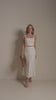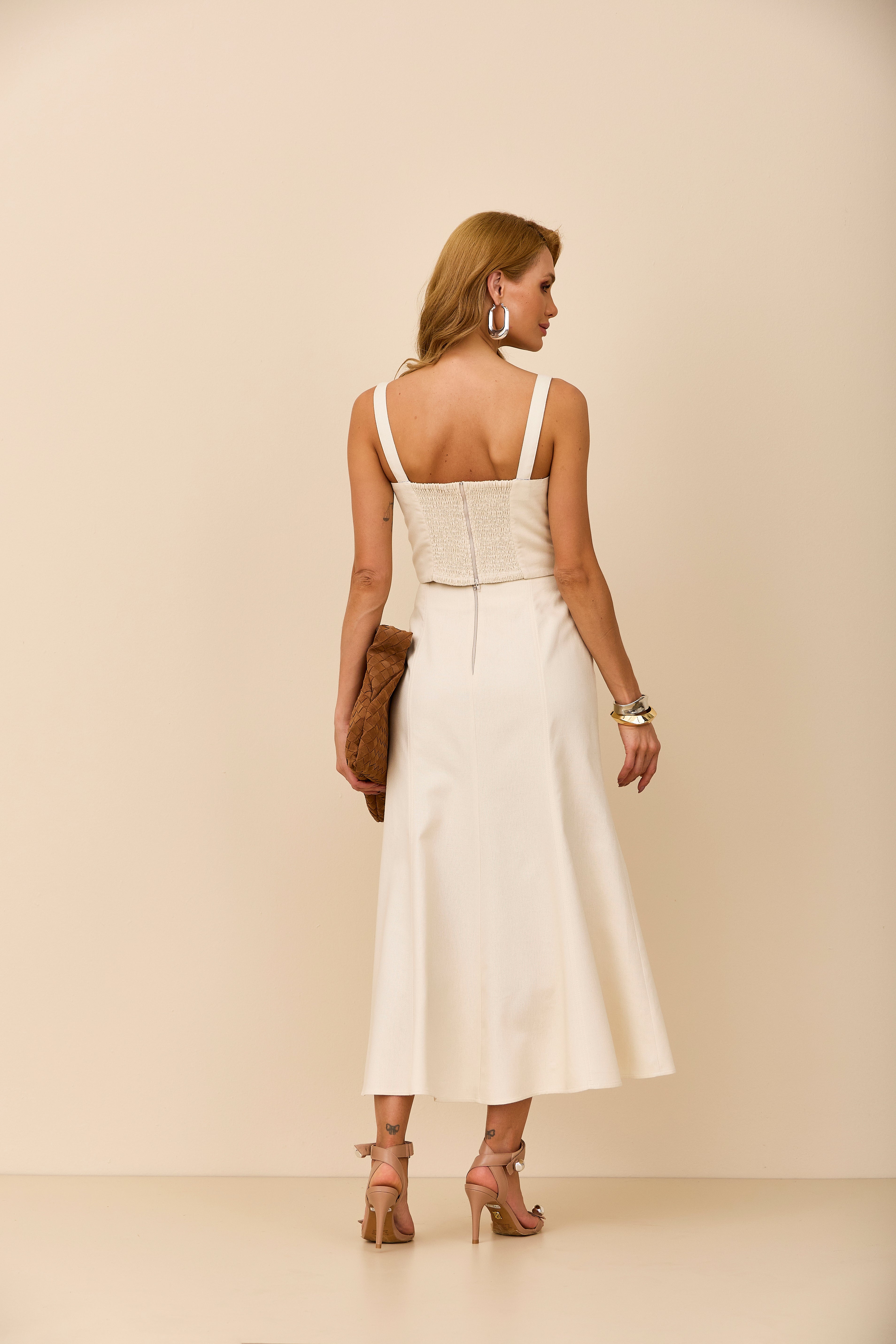 Conjunto de top e saia midi no tom bege, todo trabalhado com aplicações de flores em crochê que percorrem a peça inteira, trazendo textura, delicadeza e um charme único. Um look super chique, sofisticado e perfeito para quem ama elegância com toque artesanal.