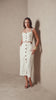 Conjunto em tom claro composto por top de alças com modelagem estruturada e botões frontais que trazem charme e sofisticação, além de detalhes em pespontos contrastantes que valorizam o design. Acompanha saia midi de caimento elegante, com fechamento frontal em botões e acabamento que alonga a silhueta, resultando em um look moderno, versátil e refinado.