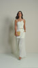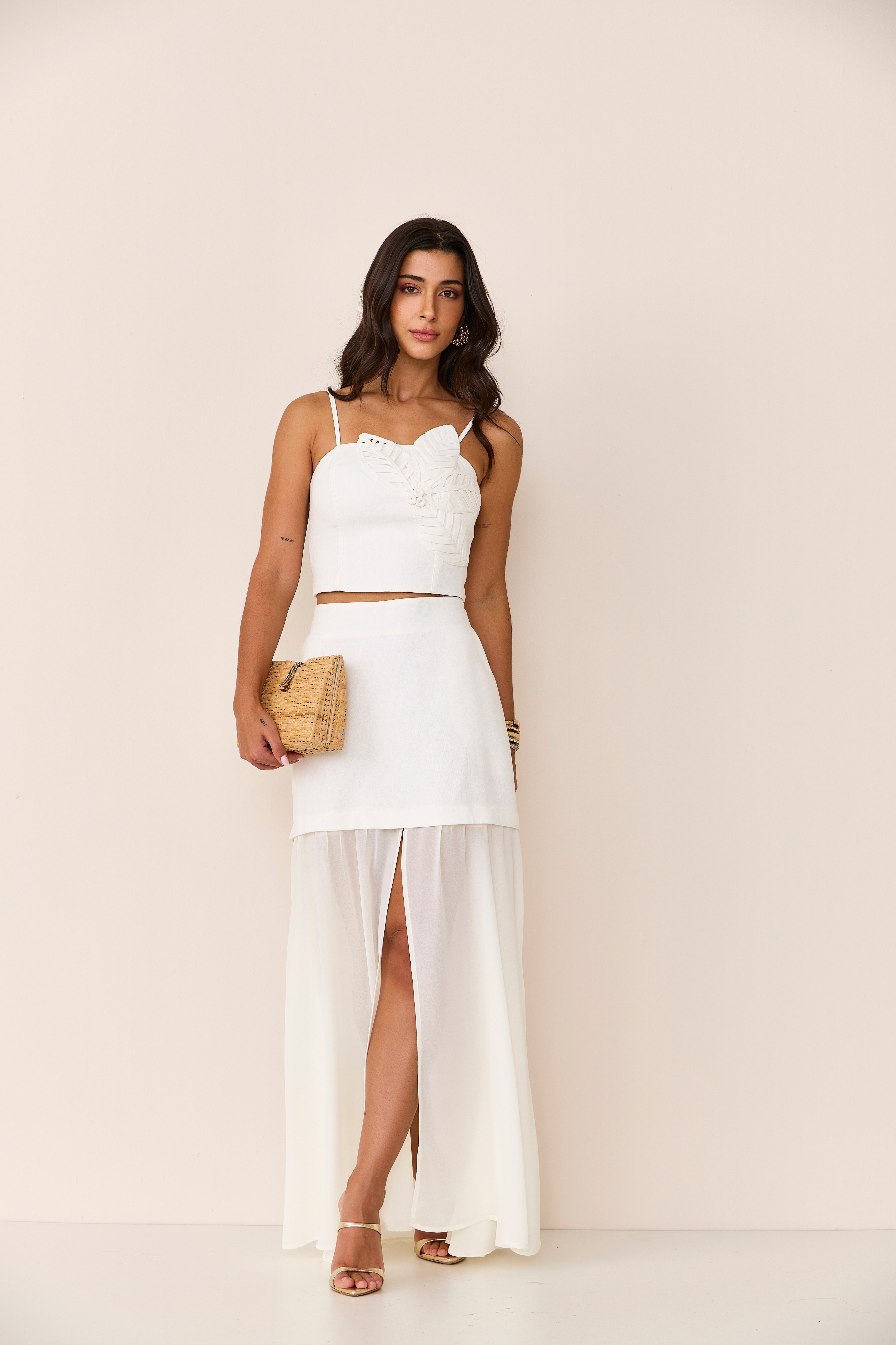Conjunto off white composto por saia longa em mousseline, com caimento leve, fluido e levemente transparente, criando um visual etéreo e sofisticado. O top traz um delicado detalhe de flor, acrescentando charme e elegância à produção. Um look refinado e perfeito para ocasiões especiais.