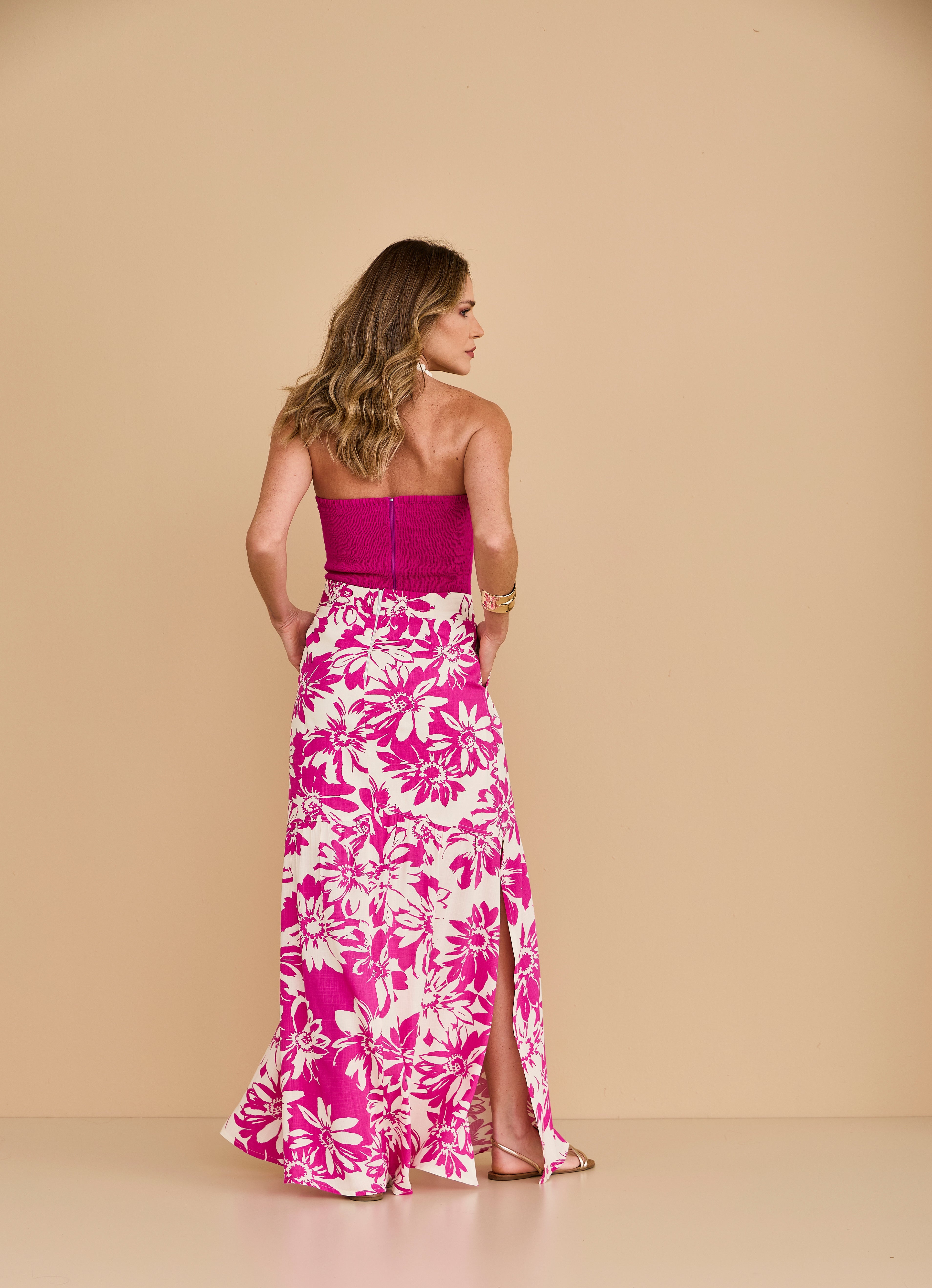 Conjunto composto por top tomara que caia em fúcsia liso, que acompanha alças removíveis, combinado à saia longa em tecido leve e fluido com estampa exclusiva Artsy. Um look elegante, moderno e marcante, perfeito para quem busca sofisticação com personalidade.