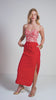 Conjunto de top bordado e saia midi vermelha, com design elegante e feminino. O top traz riqueza nos detalhes do bordado, enquanto a saia midi valoriza a silhueta com sofisticação. Um conjunto versátil e marcante, perfeito para todas as ocasiões — do casual chic aos eventos especiais.