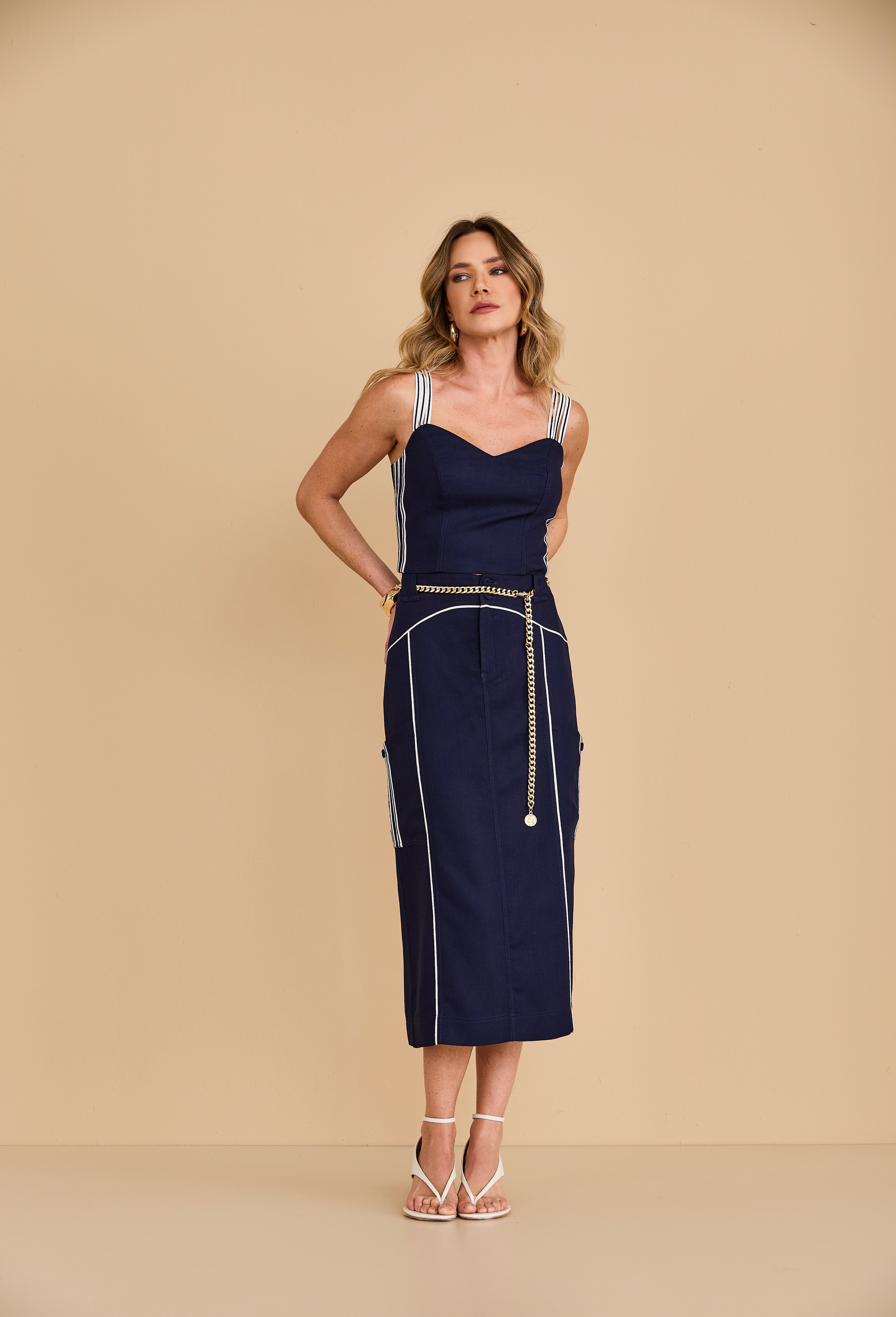 Conjunto de top e saia midi no tom azul marinho, super elegante e atemporal. A saia de modelagem reta traz delicados detalhes em vivo branco, que criam um contraste sofisticado e valorizam o design da peça. Um look moderno, refinado e cheio de estilo.