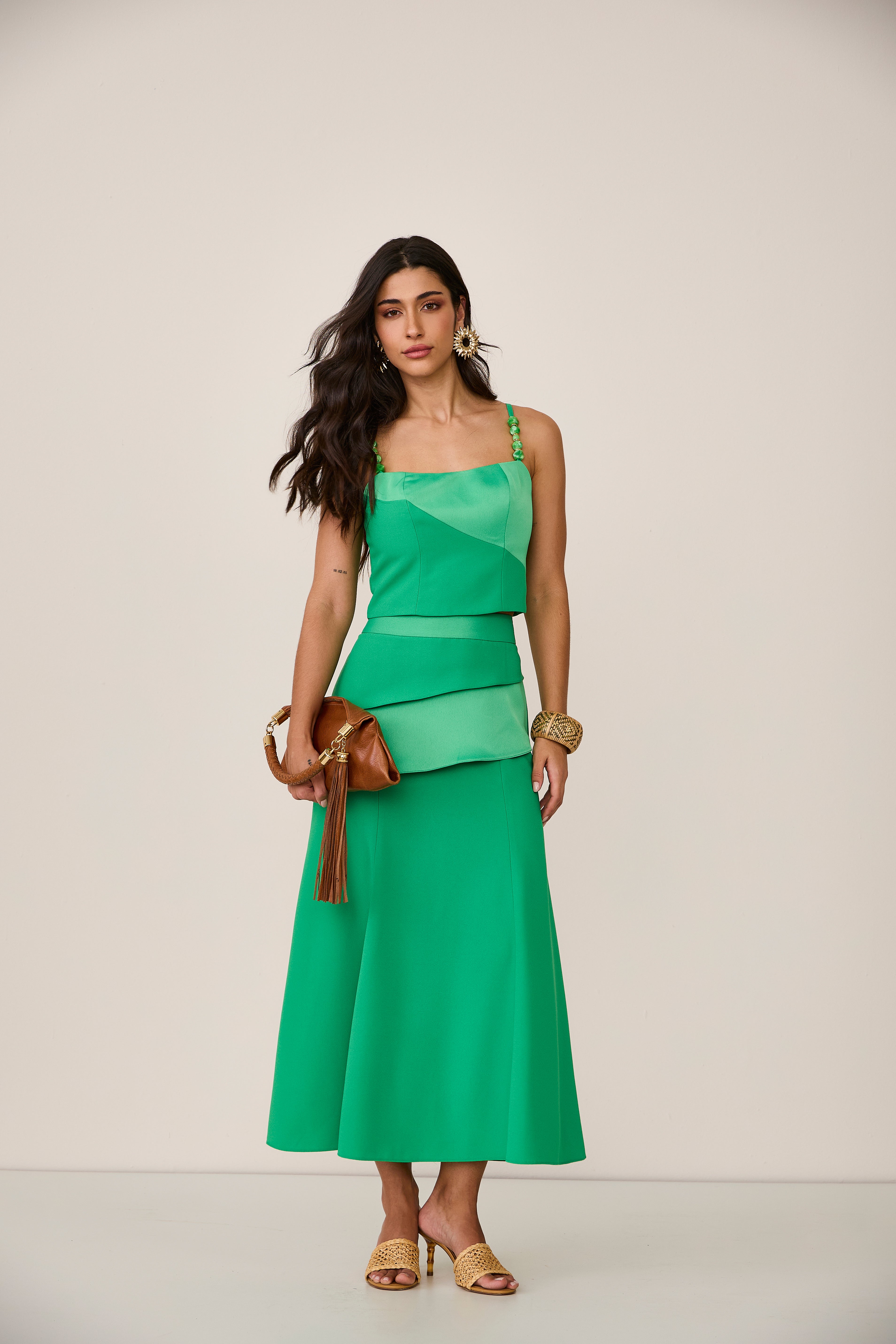 Conjunto em alfaiataria — moderno e elegante, o look combina top estruturado com recortes estratégicos e alças com delicadas ponteiras, adicionando um toque sofisticado ao design. A saia midi, também em alfaiataria, segue a mesma proposta refinada, com recortes que valorizam a silhueta e conferem um caimento impecável. Um conjunto que tem estilo, sofisticação e contemporaneidade em cada detalhe.