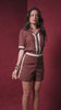 Conjunto de camisa de mangas curtas e short no tom marrom, elegante e moderno. A camisa possui gola clássica, fechamento por botões e detalhes em acabamento contrastante que valorizam o design. O short tem modelagem confortável com bolsos e detalhes laterais que harmonizam com a camisa, formando um conjunto sofisticado e cheio de estilo.