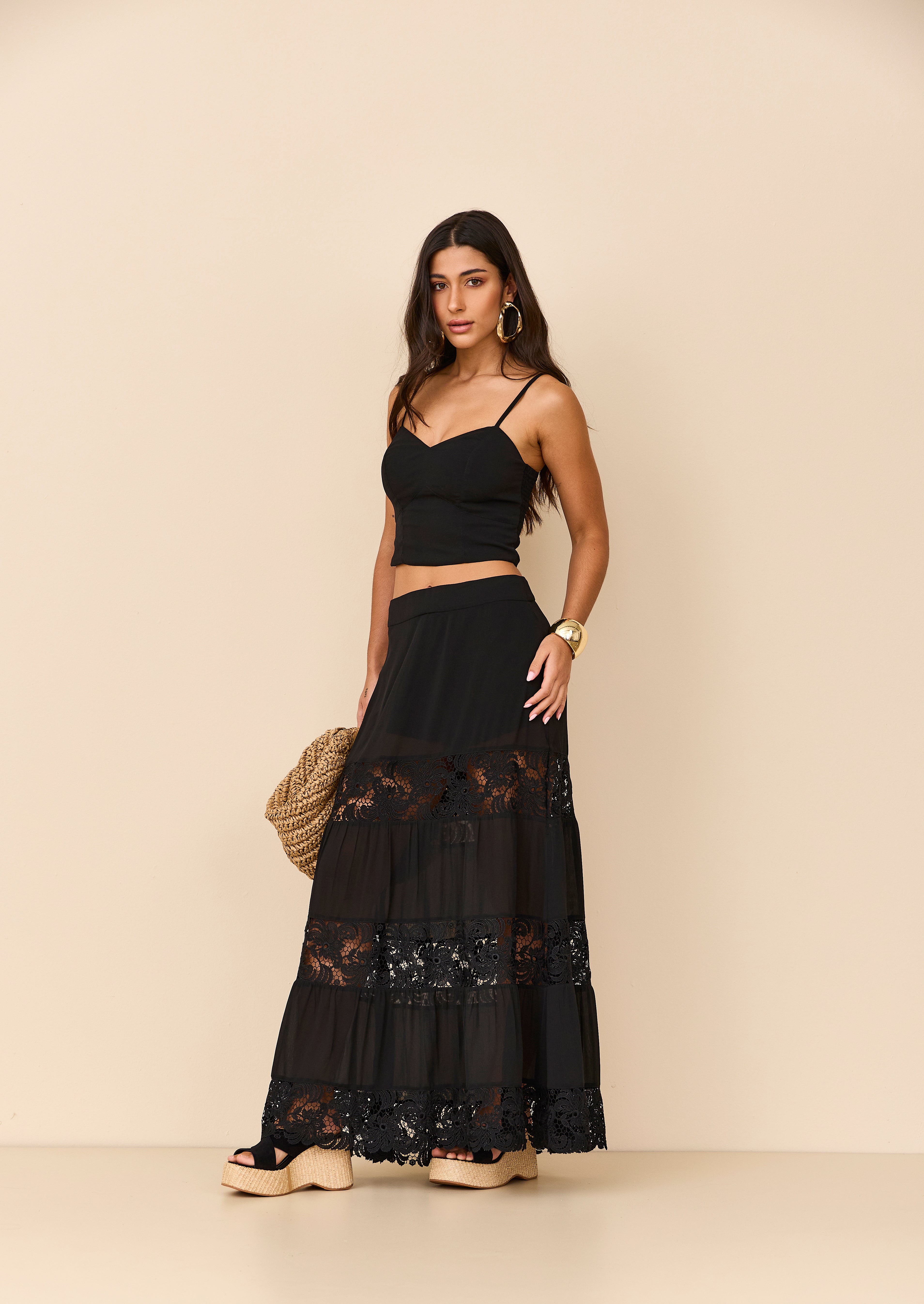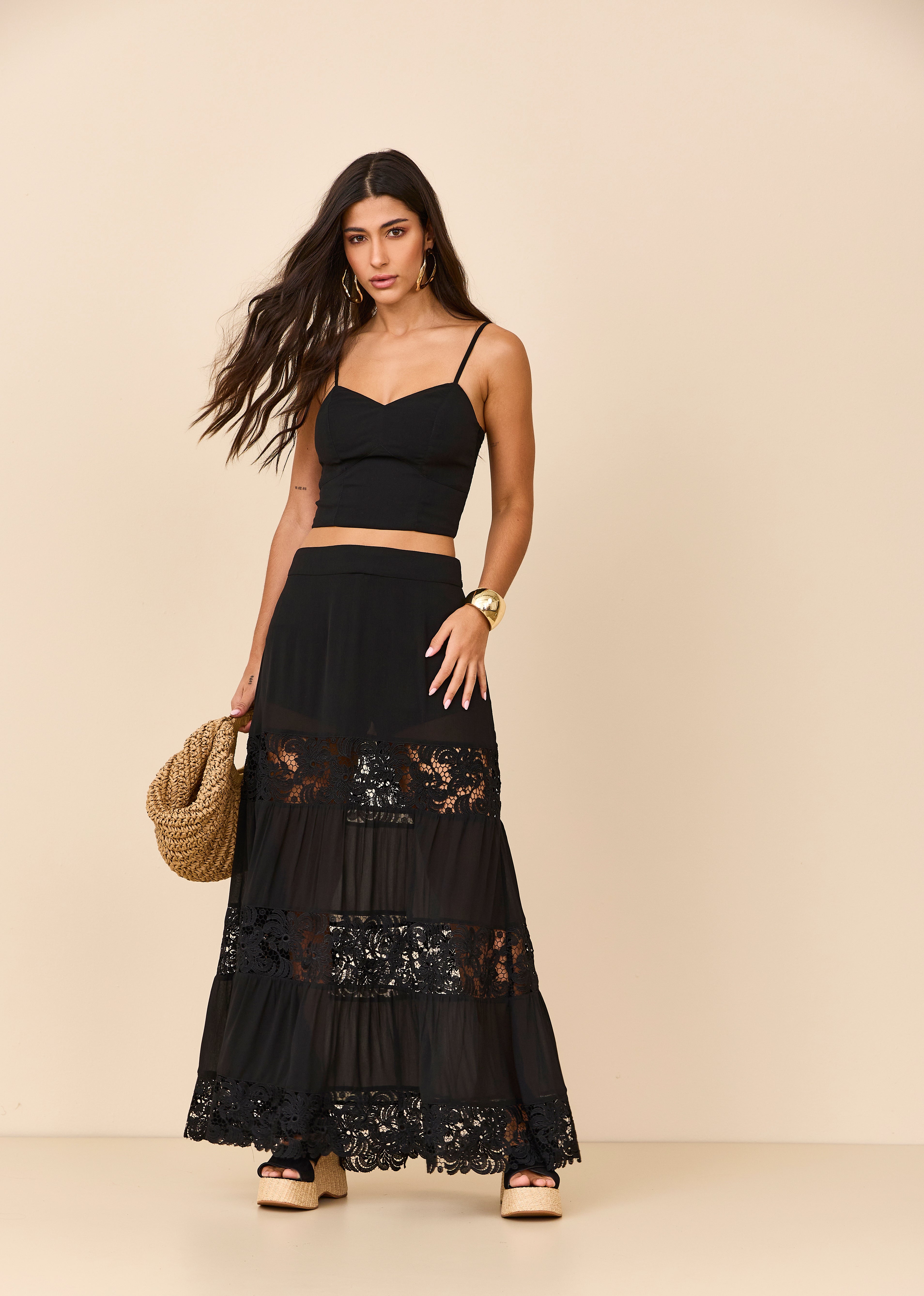 Conjunto preto super elegante composto por top de alças com caimento impecável e saia longa deslumbrante, trabalhada com delicados detalhes em renda que trazem leveza e sofisticação ao look. Um conjunto chique, atemporal e perfeito para ocasiões especiais.