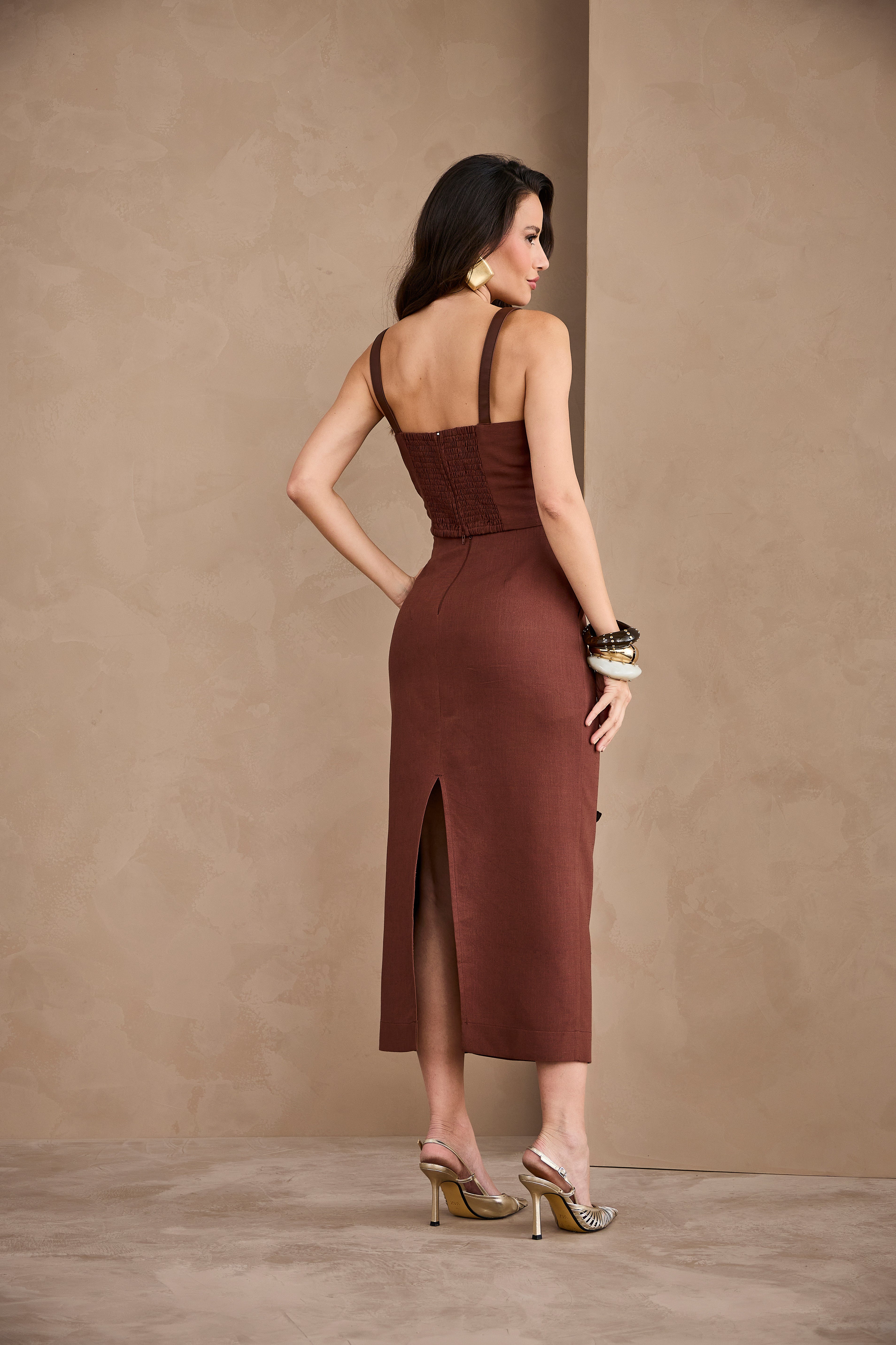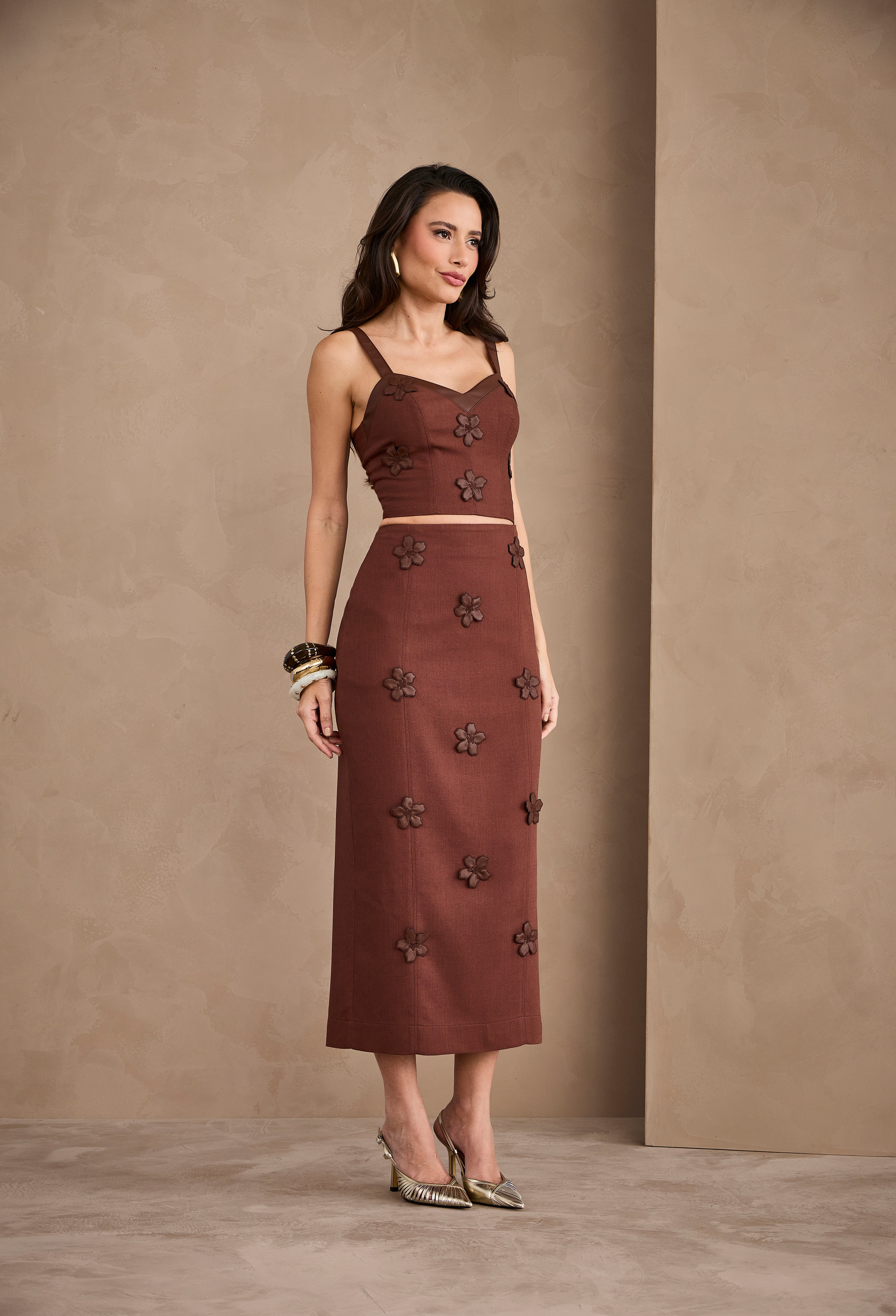 Conjunto em tom marrom que traduz sofisticação e elegância com um toque contemporâneo. A saia midi de modelagem reta valoriza a silhueta com caimento impecável, enquanto o top clássico se destaca pelos detalhes em couro nas alças e pelo decote delicado. As aplicações de flores em couro, no mesmo tom, trazem um acabamento exclusivo e refinado, tornando a peça ainda mais especial. Um look elegante e marcante, perfeito para ocasiões que pedem estilo e presença.