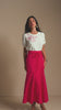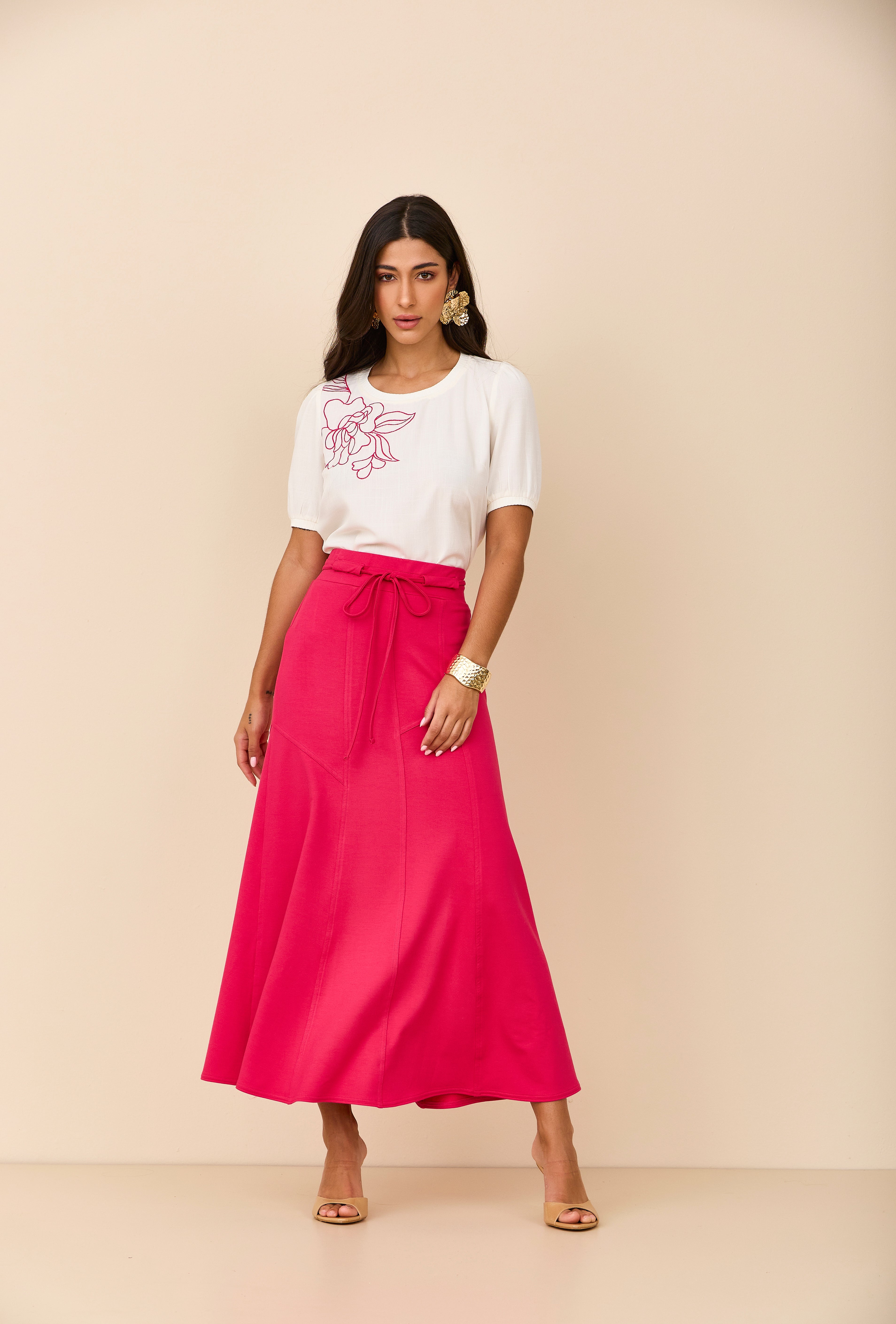 Conjunto composto por saia midi em moletom leve e fresco, no tom pink, com caimento fluido, e blusa off white de mangas curtas com detalhes de bordados no mesmo tom da saia. Um look moderno, confortável e cheio de charme, perfeito para o dia a dia com um toque elegante.