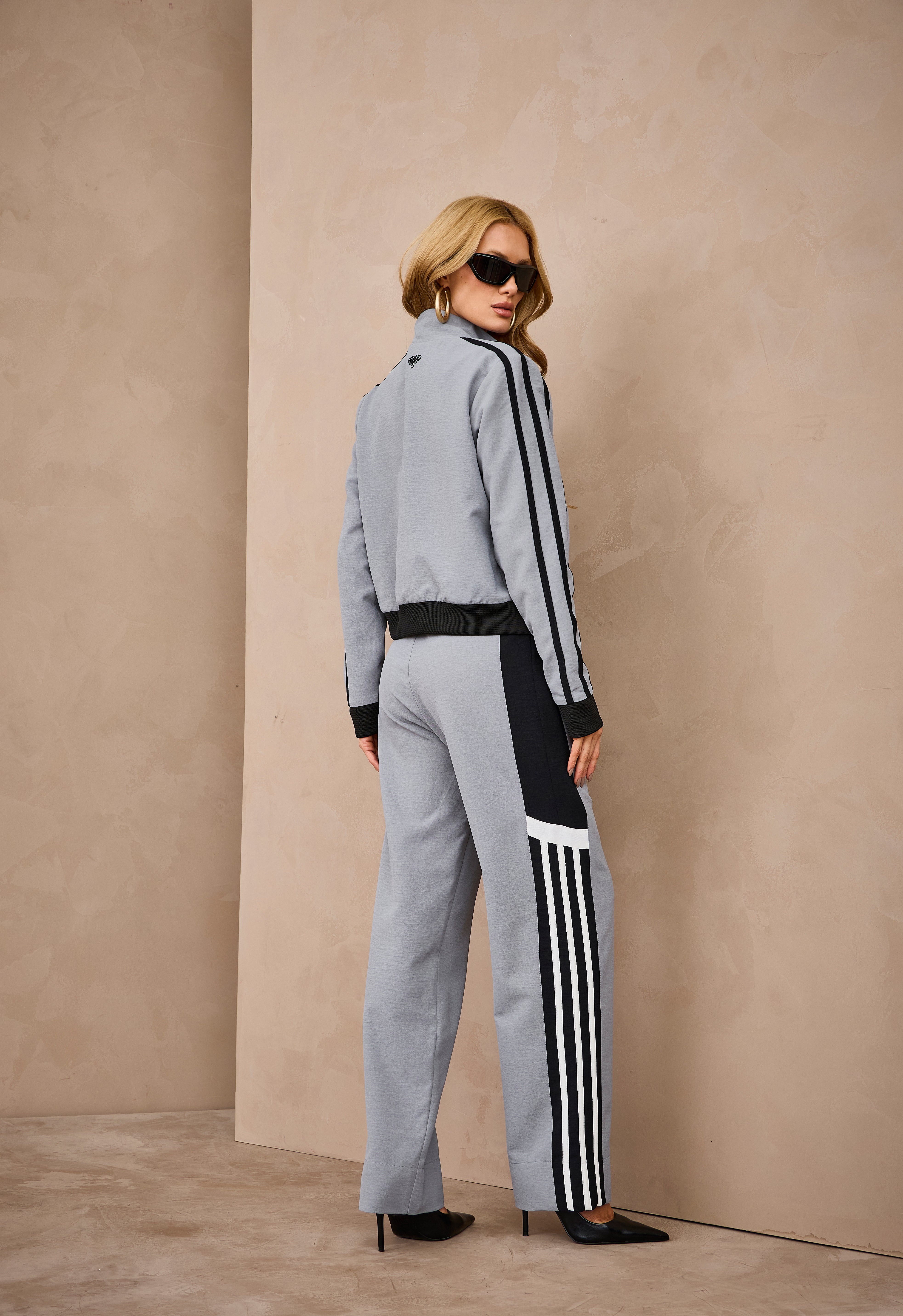 Conjunto de jaqueta e calça no tom cinza, com modernos recortes em preto e branco que trazem um contraste sofisticado e atual à peça. Com proposta comfy e elegante, o conjunto une estilo e versatilidade, permitindo composições que transitam do casual ao mais arrumado com facilidade. A modelagem apresenta caimento leve e confortável, proporcionando liberdade de movimento sem abrir mão da elegância, ideal para diferentes ocasiões com um toque contemporâneo.