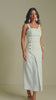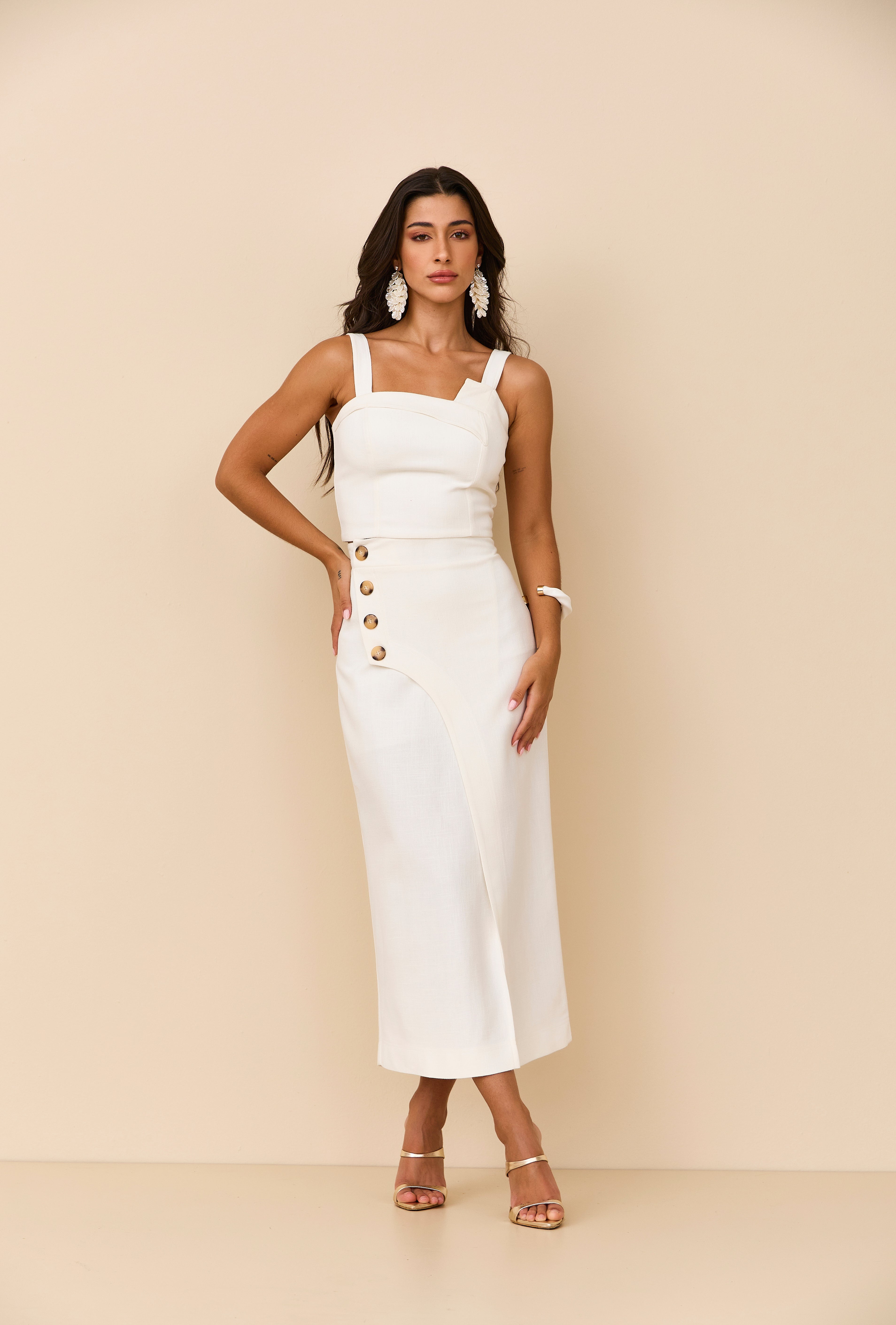 Conjunto em linho off white composto por saia midi com detalhes em botões frontais e top de alças com recortes que valorizam o design da peça. Um look leve, elegante e sofisticado, ideal para ocasiões especiais.