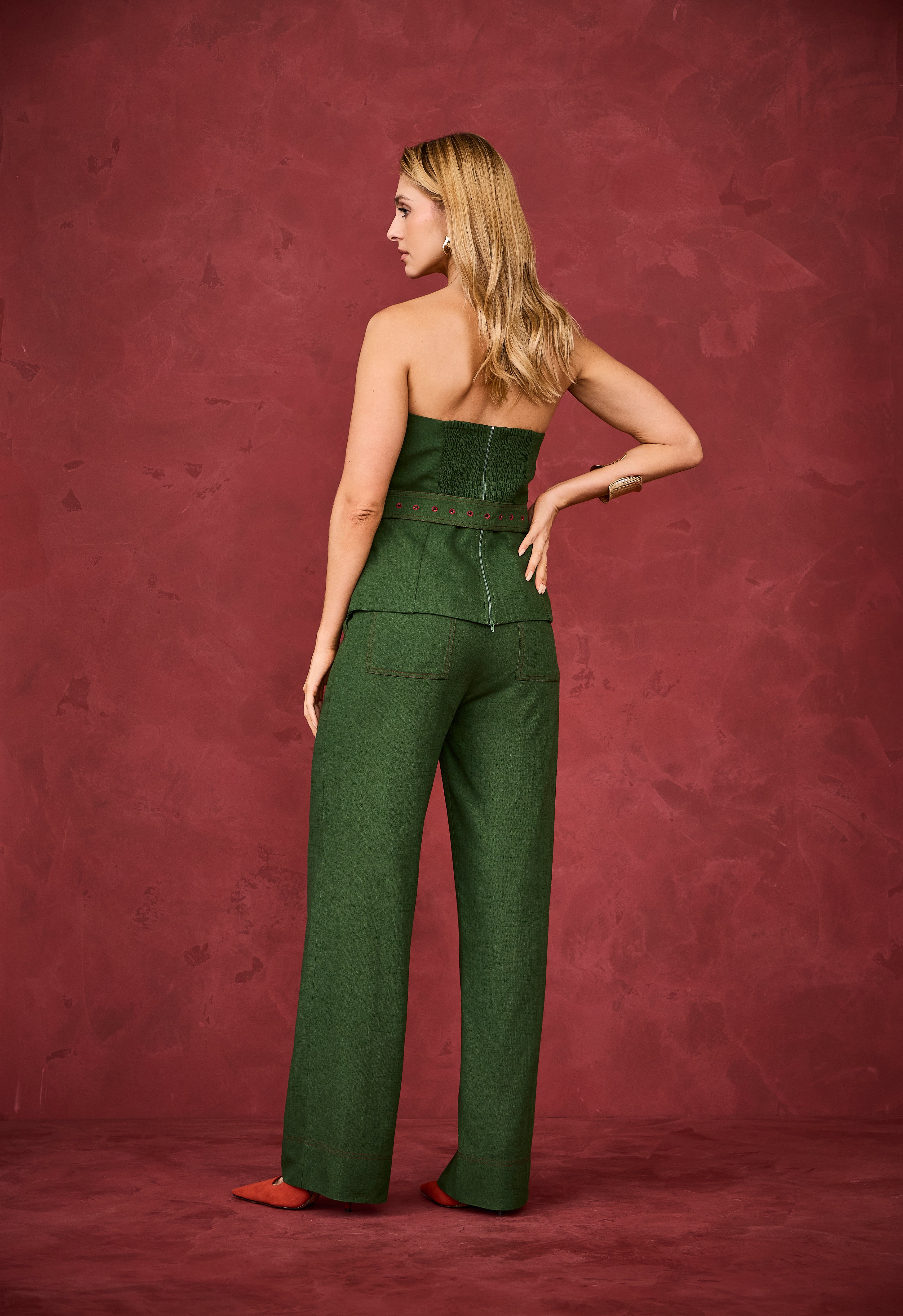 Conjunto sofisticado e moderno em tom verde profundo, composto por top tomara que caia estruturado, com recortes marcantes que valorizam o busto e trazem um design elegante. O destaque fica por conta do cinto no mesmo tecido, com fivela forrada, que acintura a silhueta com muito charme. A calça possui modelagem reta e alongada, com caimento impecável, garantindo elegância e conforto. Uma proposta poderosa, chique e cheia de personalidade, perfeita para produções refinadas e atuais.