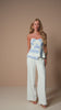 Conjunto de calça off white com blusa peplum de listras azuis, modelagem super elegante que valoriza a silhueta. Um look sofisticado e atemporal, perfeito para produções leves e cheias de estilo.