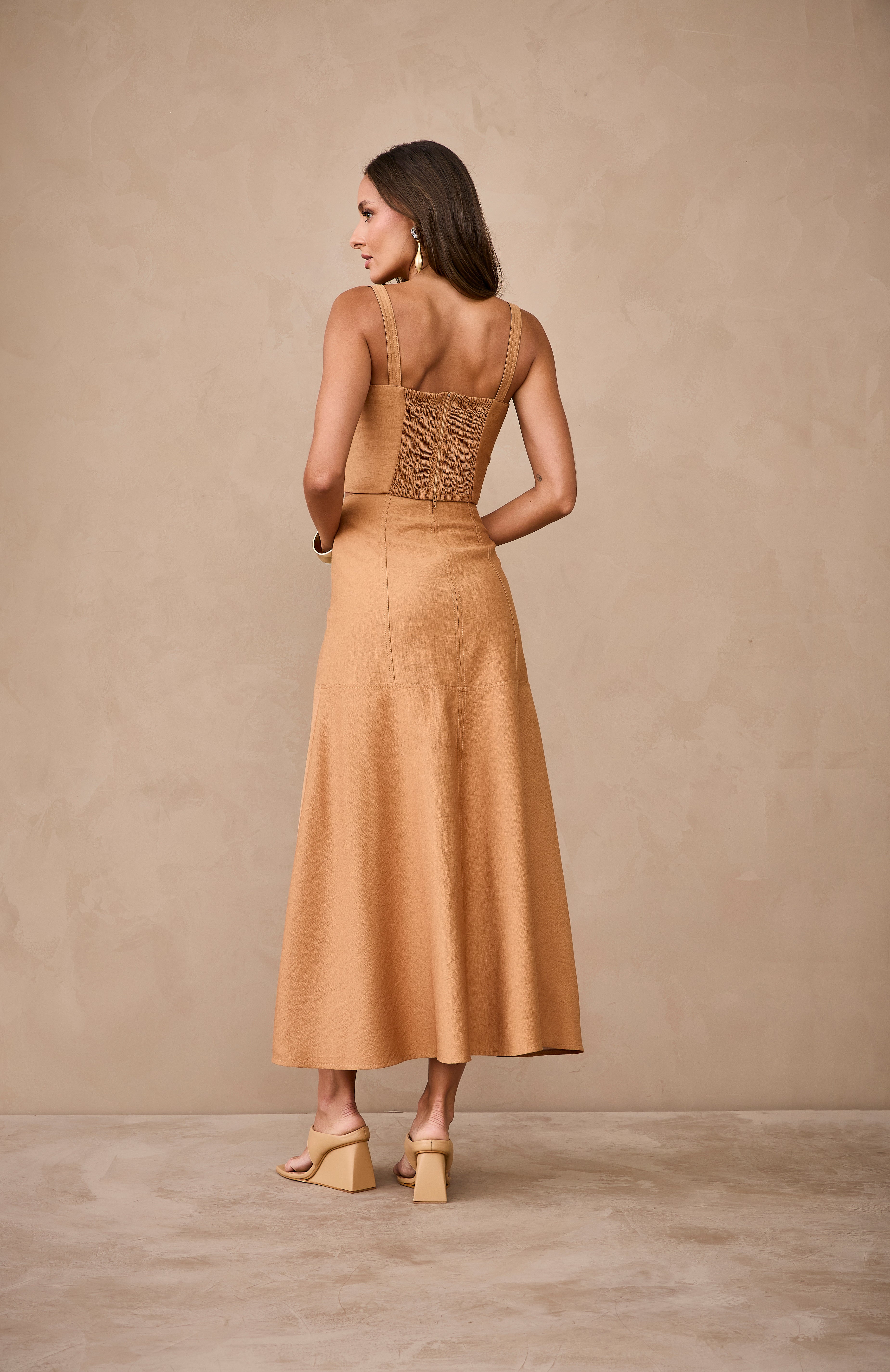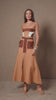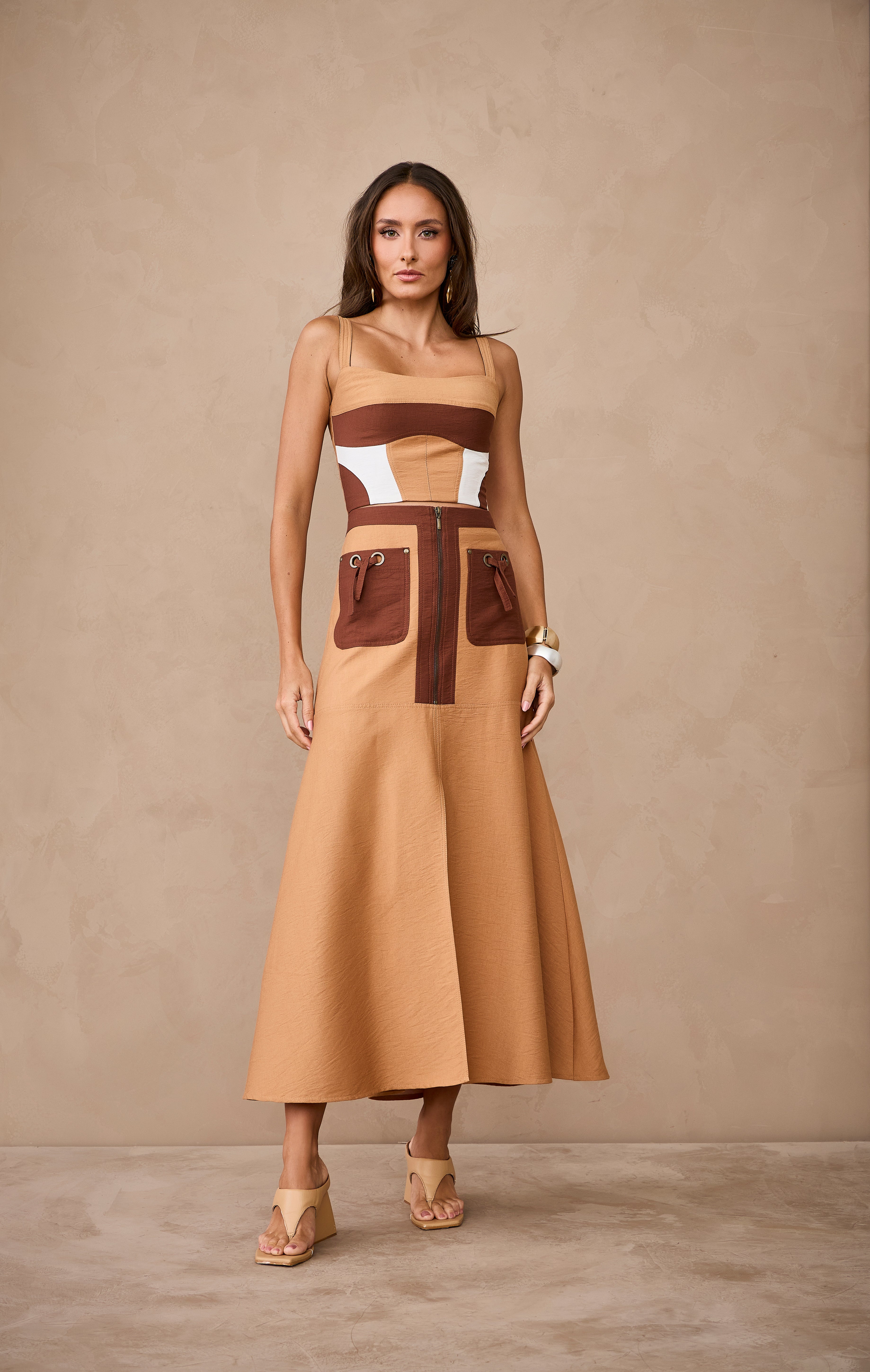 Conjunto em tons terrosos composto por top de alças com modelagem estruturada que valoriza o busto, destacando o design com recortes em contraste que trazem modernidade à peça. Acompanha saia longa de caimento amplo e elegante, com bolsos frontais utilitários e fechamento em zíper que agrega estilo e funcionalidade. Um look sofisticado e contemporâneo, perfeito para produções marcantes.