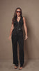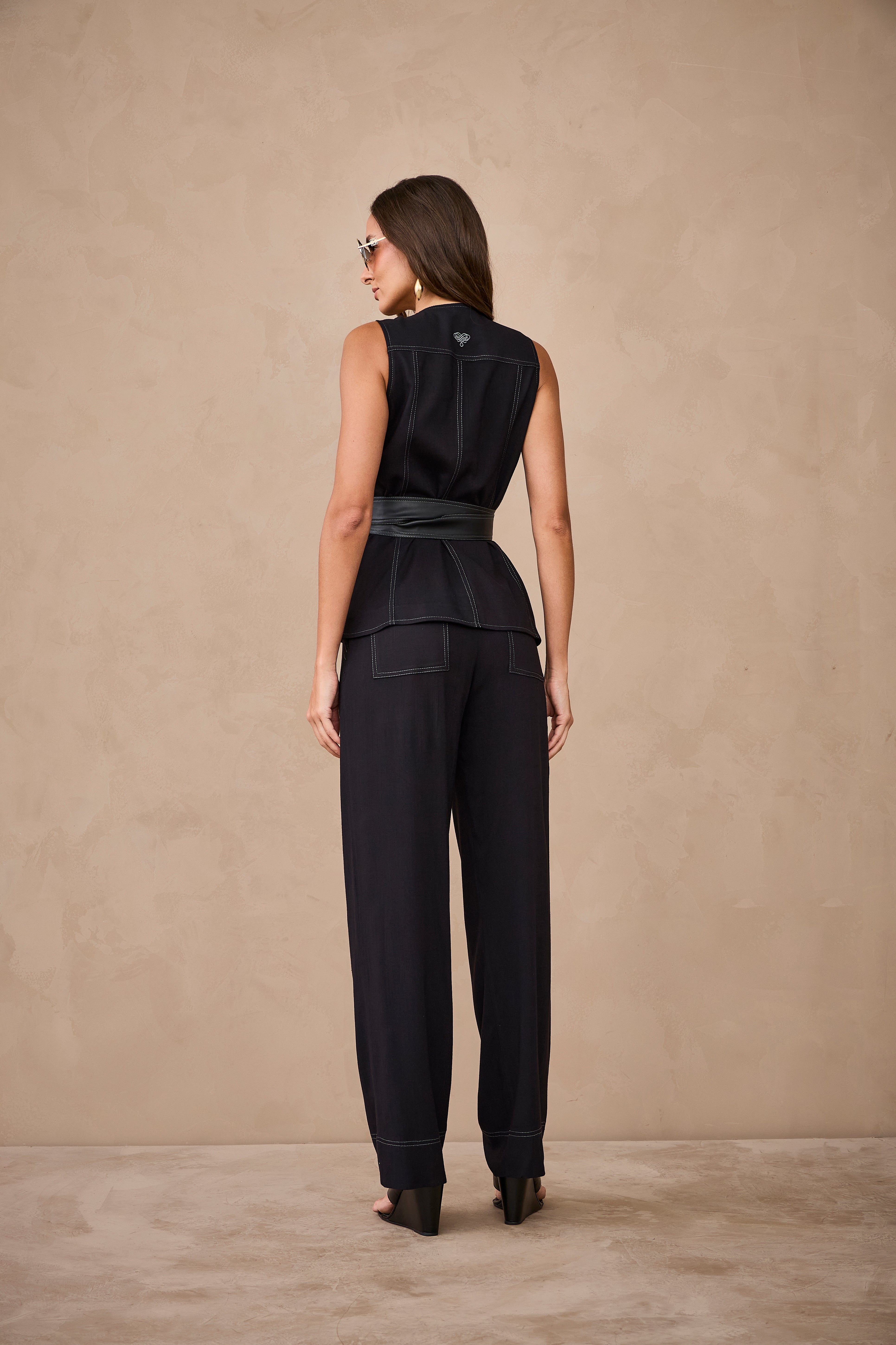 Conjunto sofisticado que une elegância e atitude em um design moderno. A blusa estilo parka cavada possui fechamento em zíper frontal e detalhes de aplicações de tachas, trazendo um toque contemporâneo e marcante à peça. Acompanha faixa em couro para amarração, valorizando a silhueta com charme. A calça de modelagem reta completa o look com caimento impecável e proposta clássica. Um conjunto poderoso e versátil, perfeito para produções elegantes com personalidade.