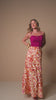 Conjunto de top e saia longa super elegante. O top em fúcsia liso traz pedrarias delicadas nas alças e detalhe de amarração sutil no busto em vivo, valorizando a peça com charme e sofisticação. A saia longa em estampa exclusiva Artsy, com fundo amarelo manteiga e flores no tom do top, completa o look com leveza, movimento e um visual marcante e refinado.