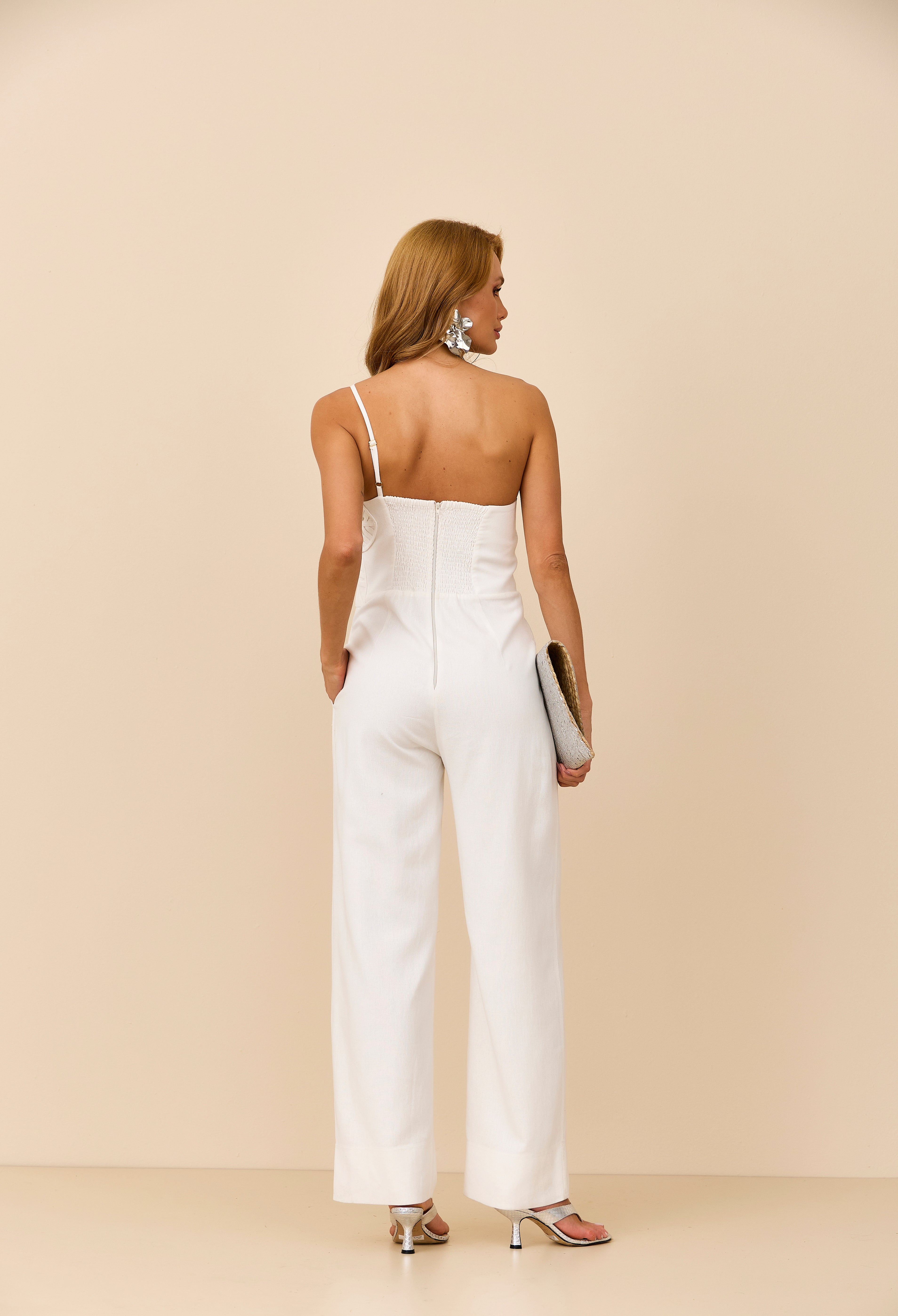 Macacão longo off white, simplesmente deslumbrante — daquelas peças que transformam qualquer ocasião. Com uma alça só e uma flor em alto relevo que destaca o busto com elegância, ele une modernidade, sofisticação e um caimento impecável. Perfeito para festas de fim de ano, é aquele look chique, marcante e atemporal que faz você brilhar sem esforço.