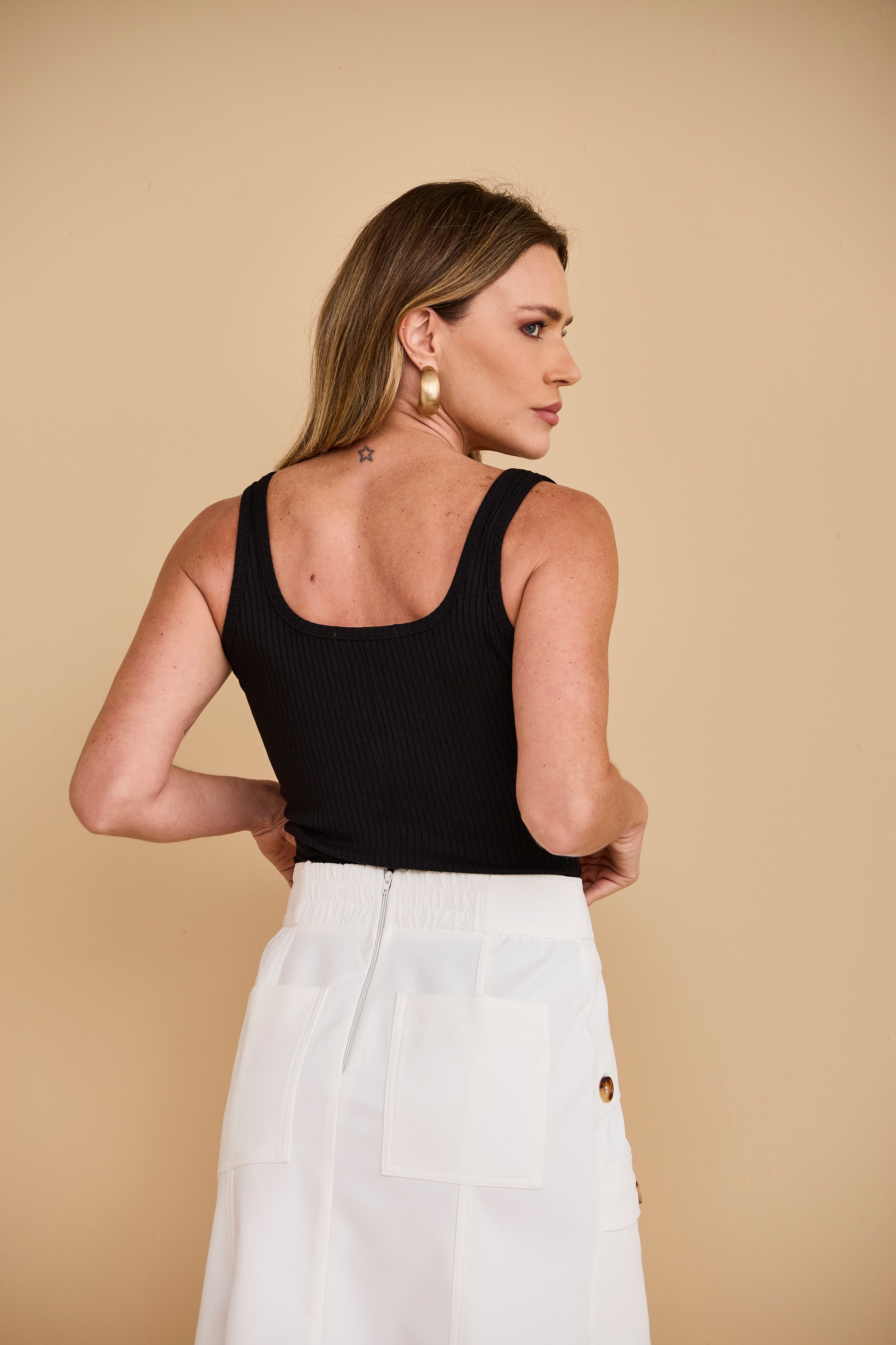 Regata preta canelada com aplicação de flores bordadas e contorno colorido, trazendo um contraste moderno e delicado que transforma a peça em um destaque cheio de charme. Uma opção versátil, estilosa e super elegante.
