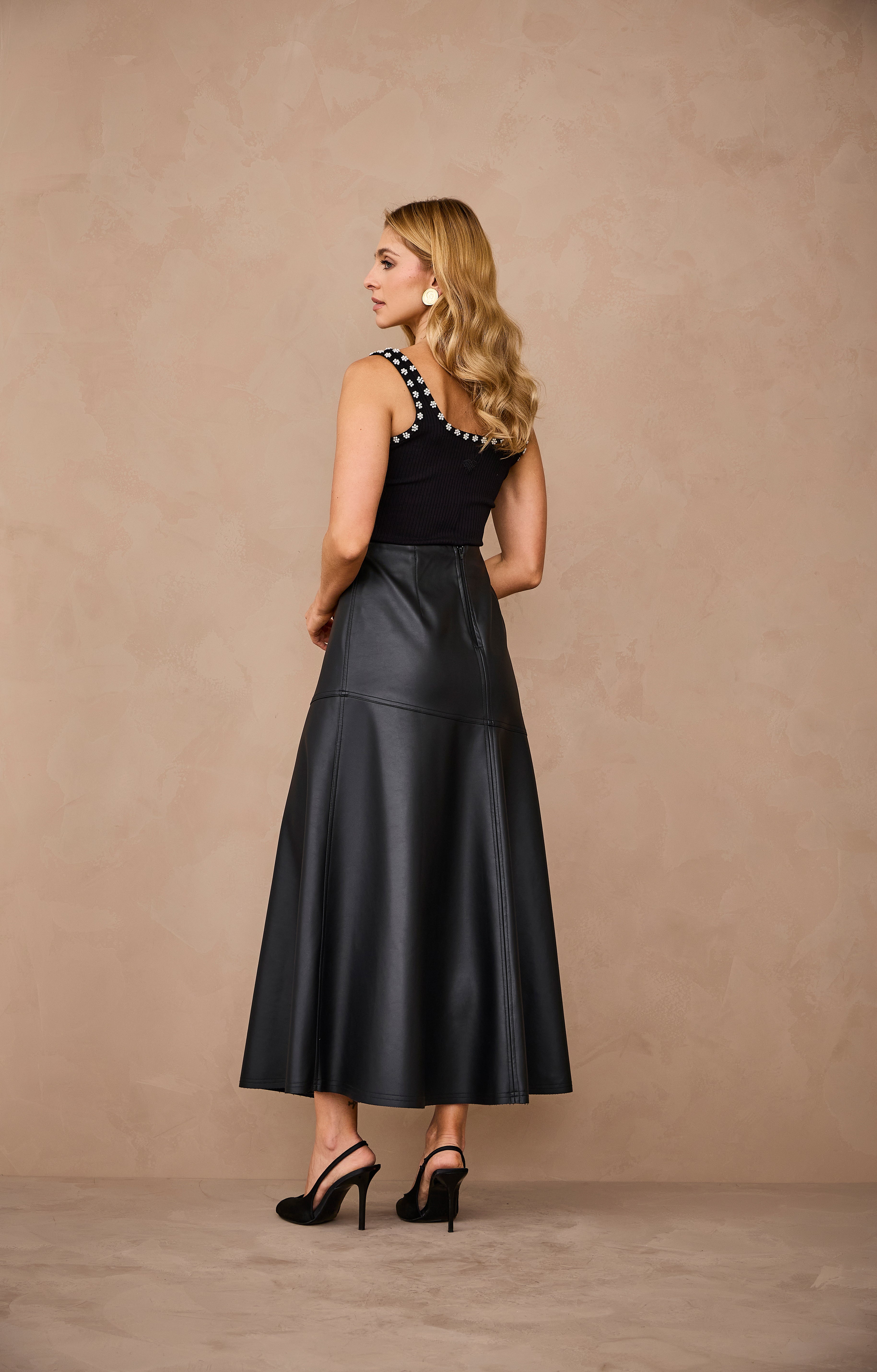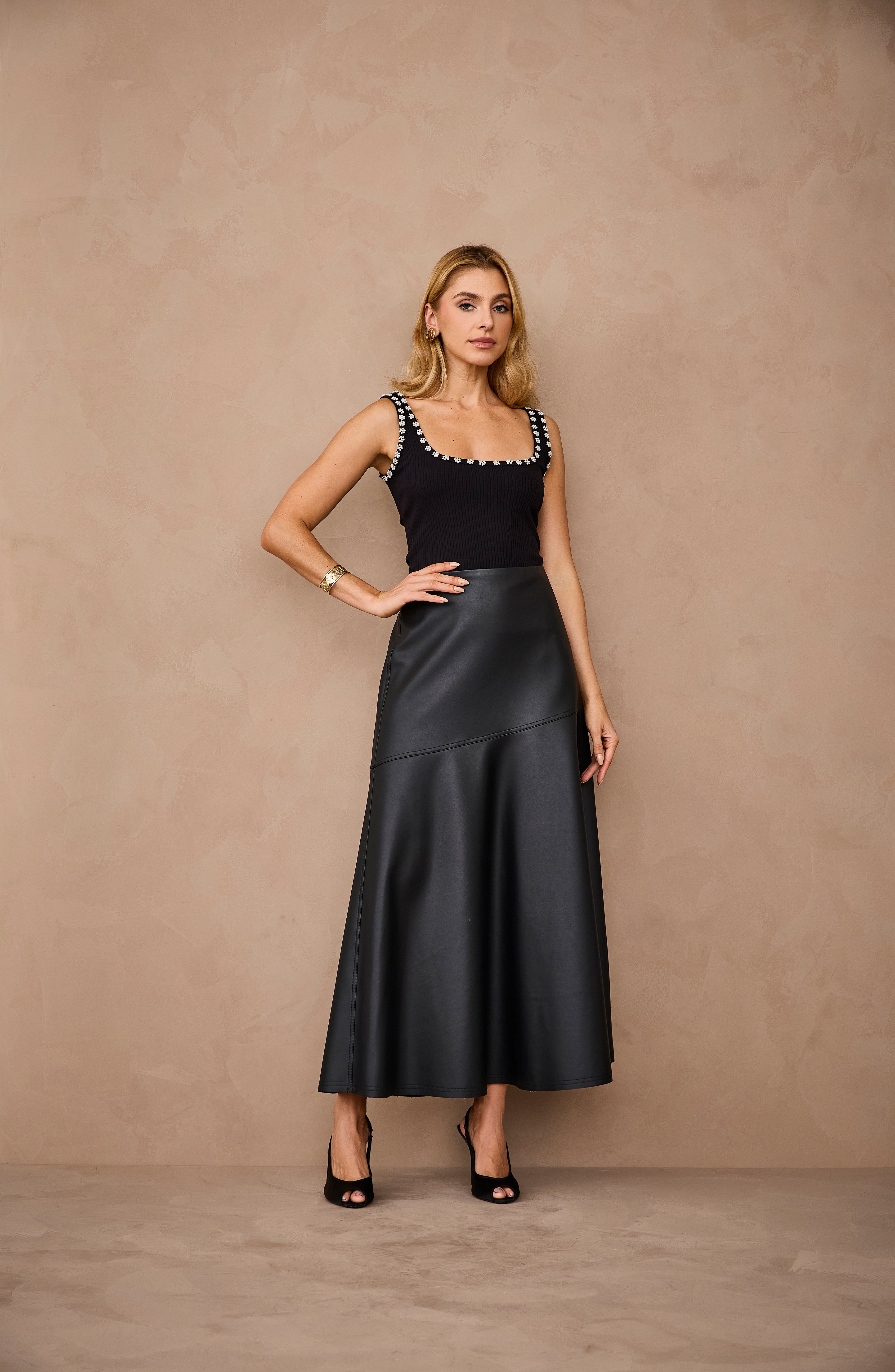Regata canelada preta com delicados bordados de pérolas em formato de pequenas flores nas alças, trazendo um toque feminino e sofisticado à peça. Elegante e charmosa, é ideal para elevar o visual com sutileza e delicadeza.