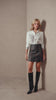 Saia curta de couro preta, clássica e feminina, com modelagem que valoriza a silhueta. Os recortes estratégicos e o detalhe de costura em tom marrom trazem contraste sutil, adicionando um toque delicado e charmoso ao look.