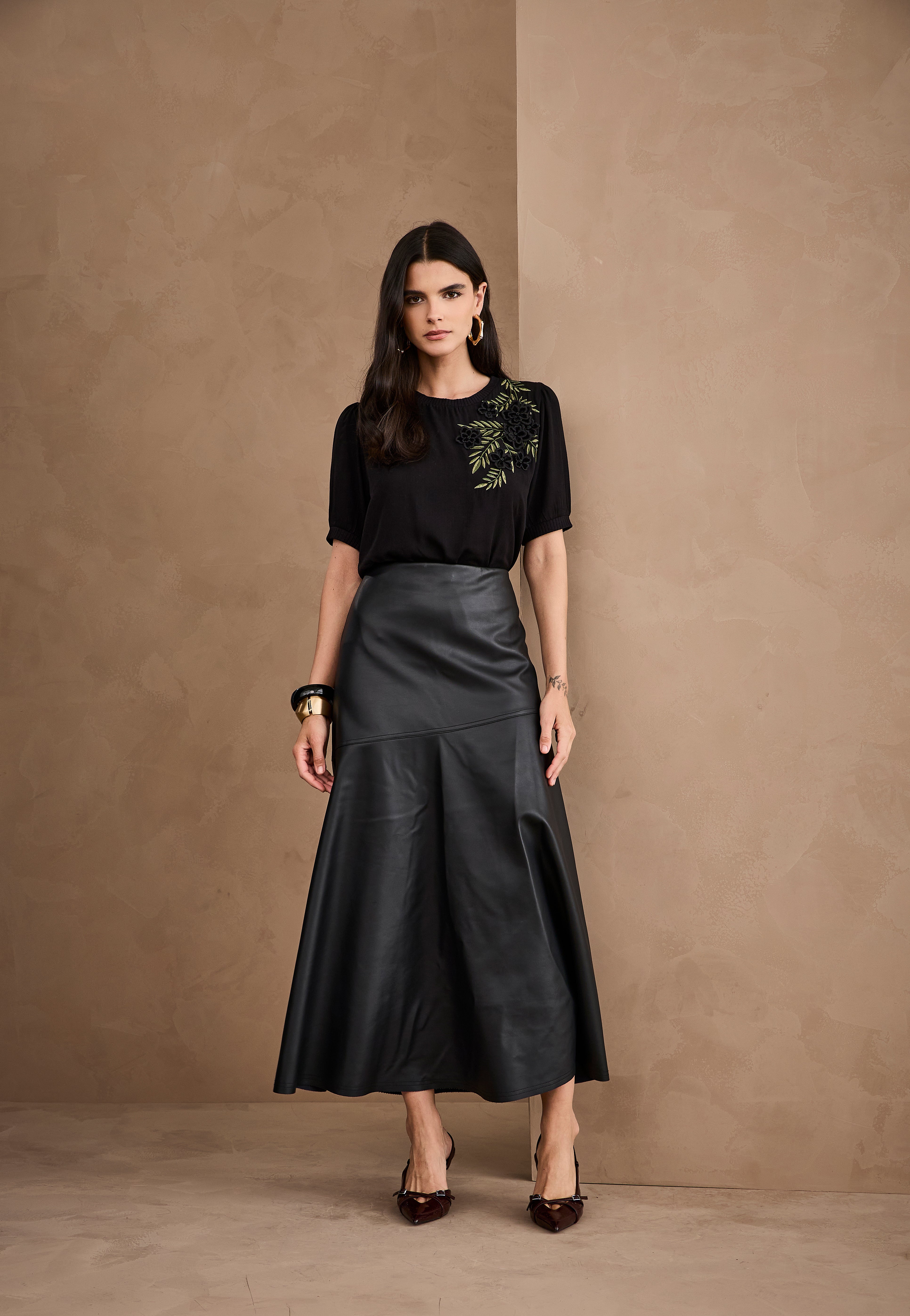 Saia midi de couro com modelagem elegante e levemente fluida, que valoriza a silhueta com sofisticação e modernidade. Uma peça atemporal e marcante, perfeita para compor looks estilosos e cheios de personalidade.