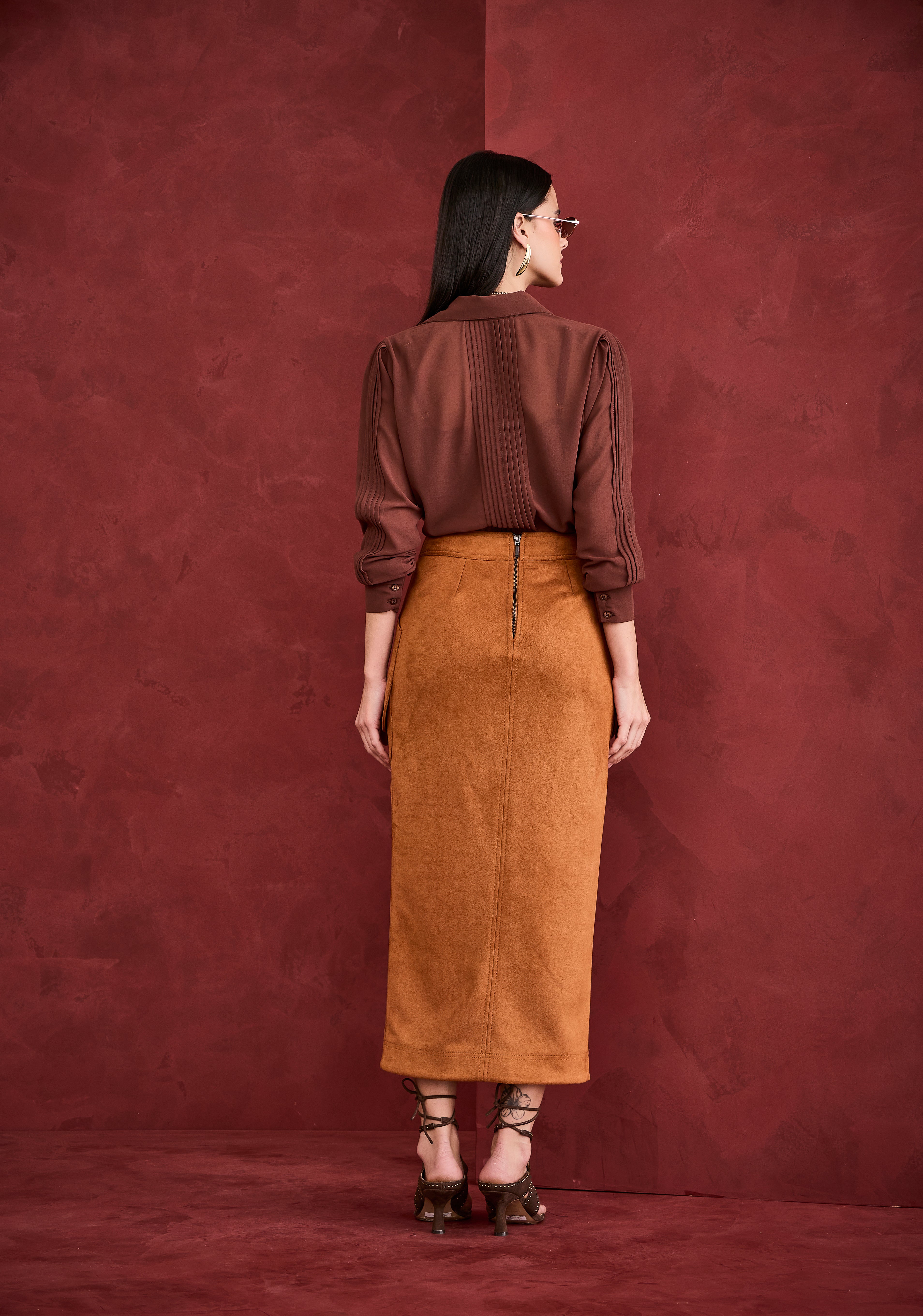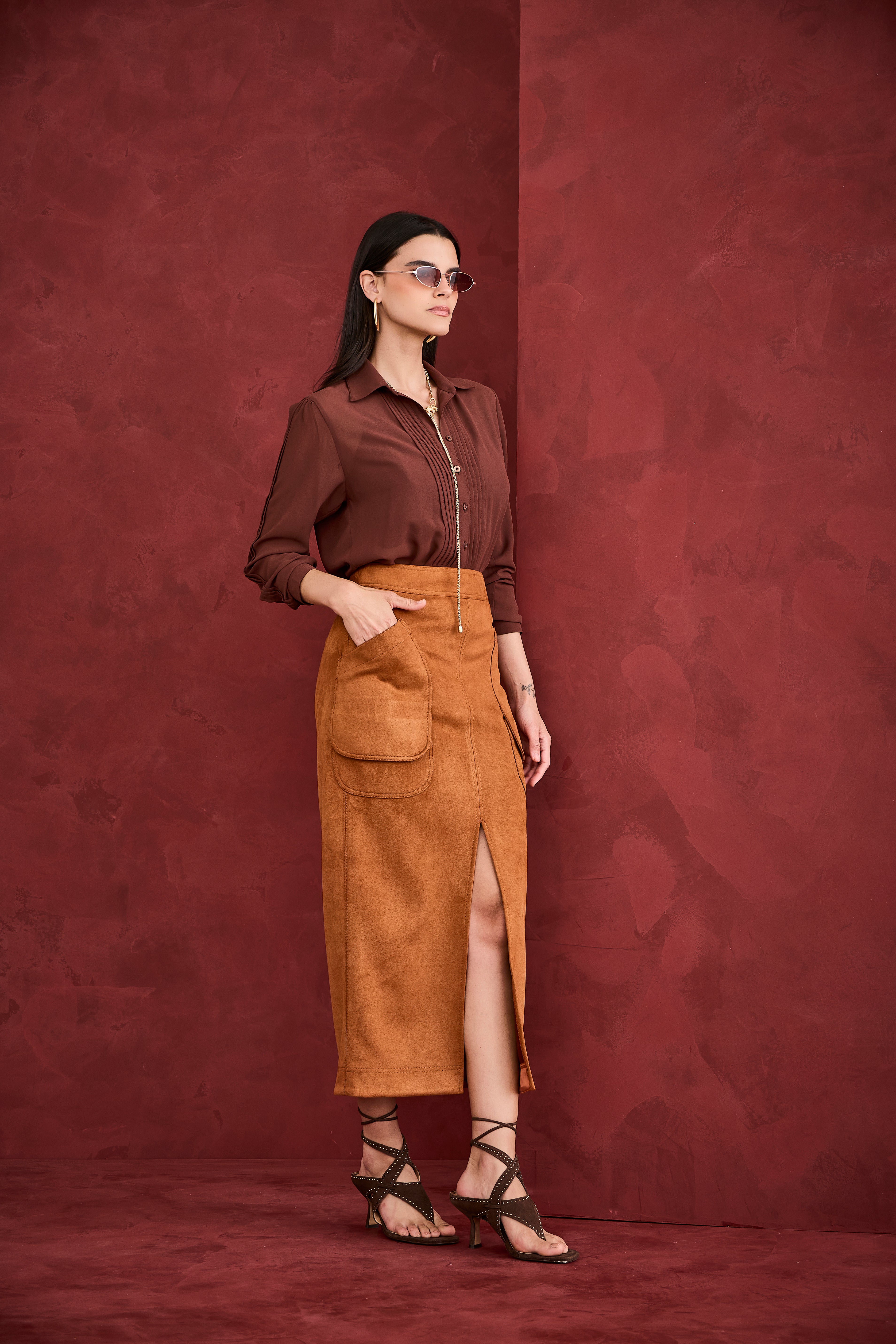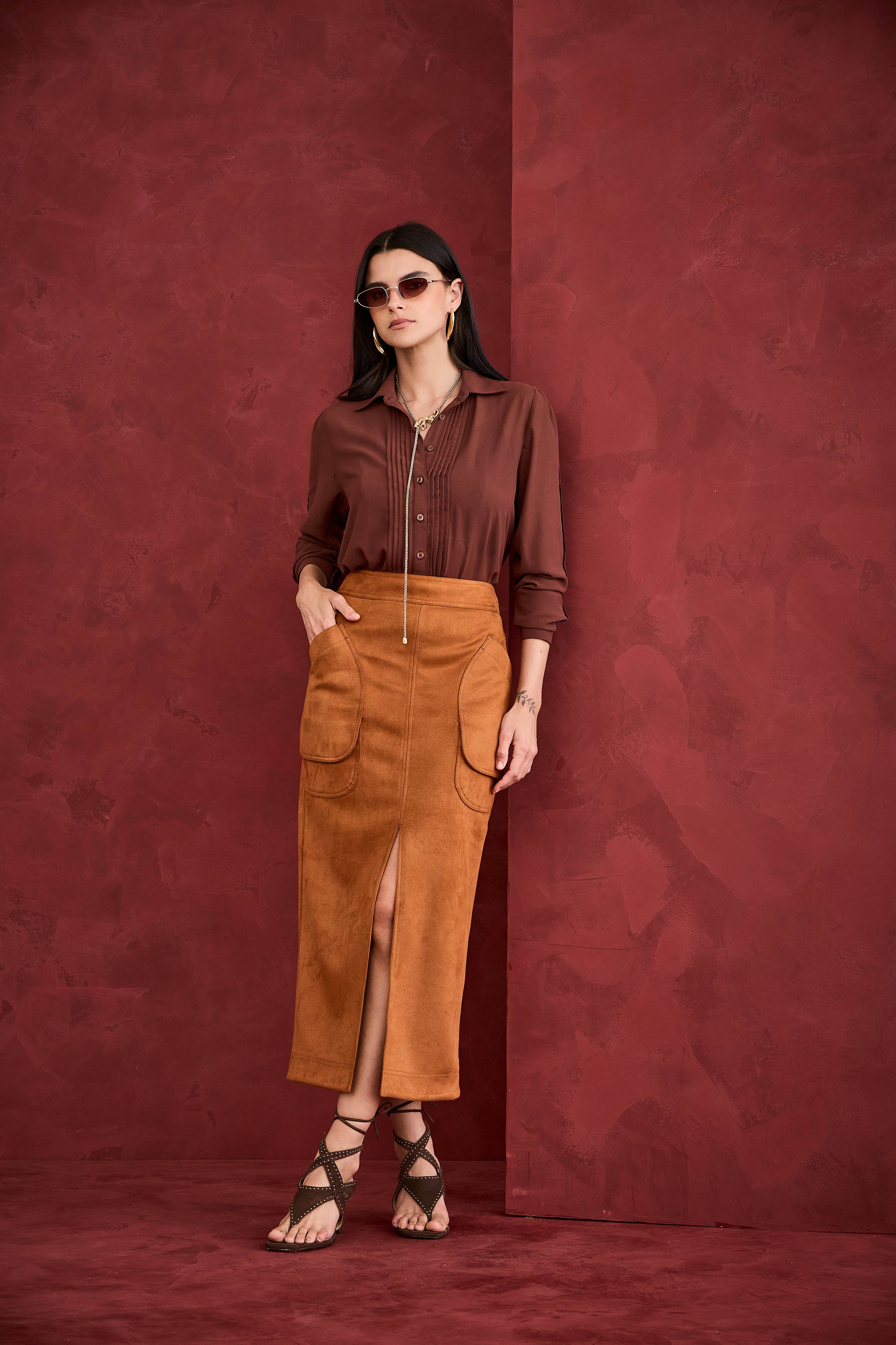 Saia midi em suede marrom com modelagem reta, bolsos laterais e fenda frontal que adiciona charme e sofisticação ao visual. Super elegante, é uma peça marcante que une estilo e personalidade, perfeita para composições refinadas com identidade Artsy.