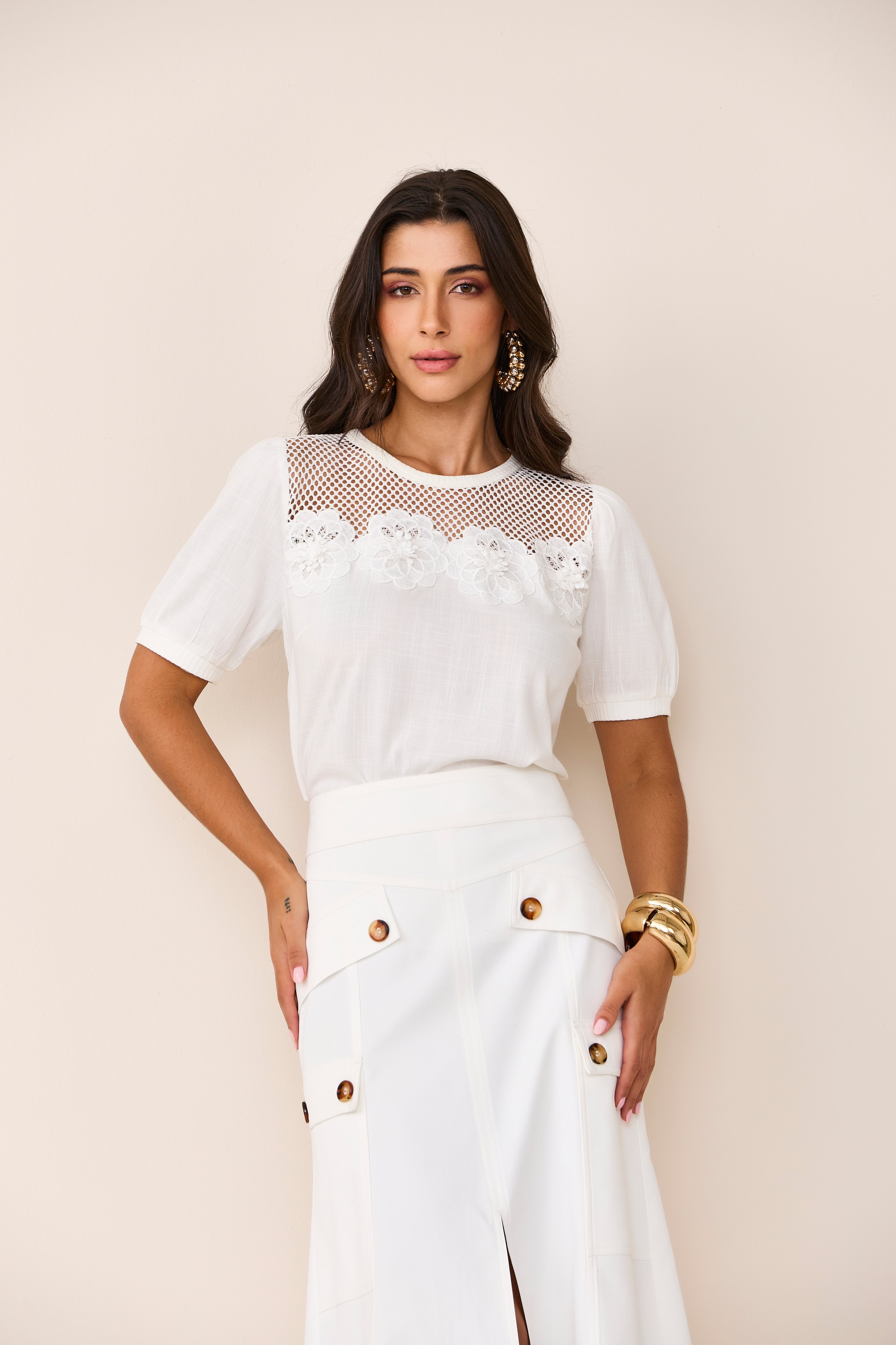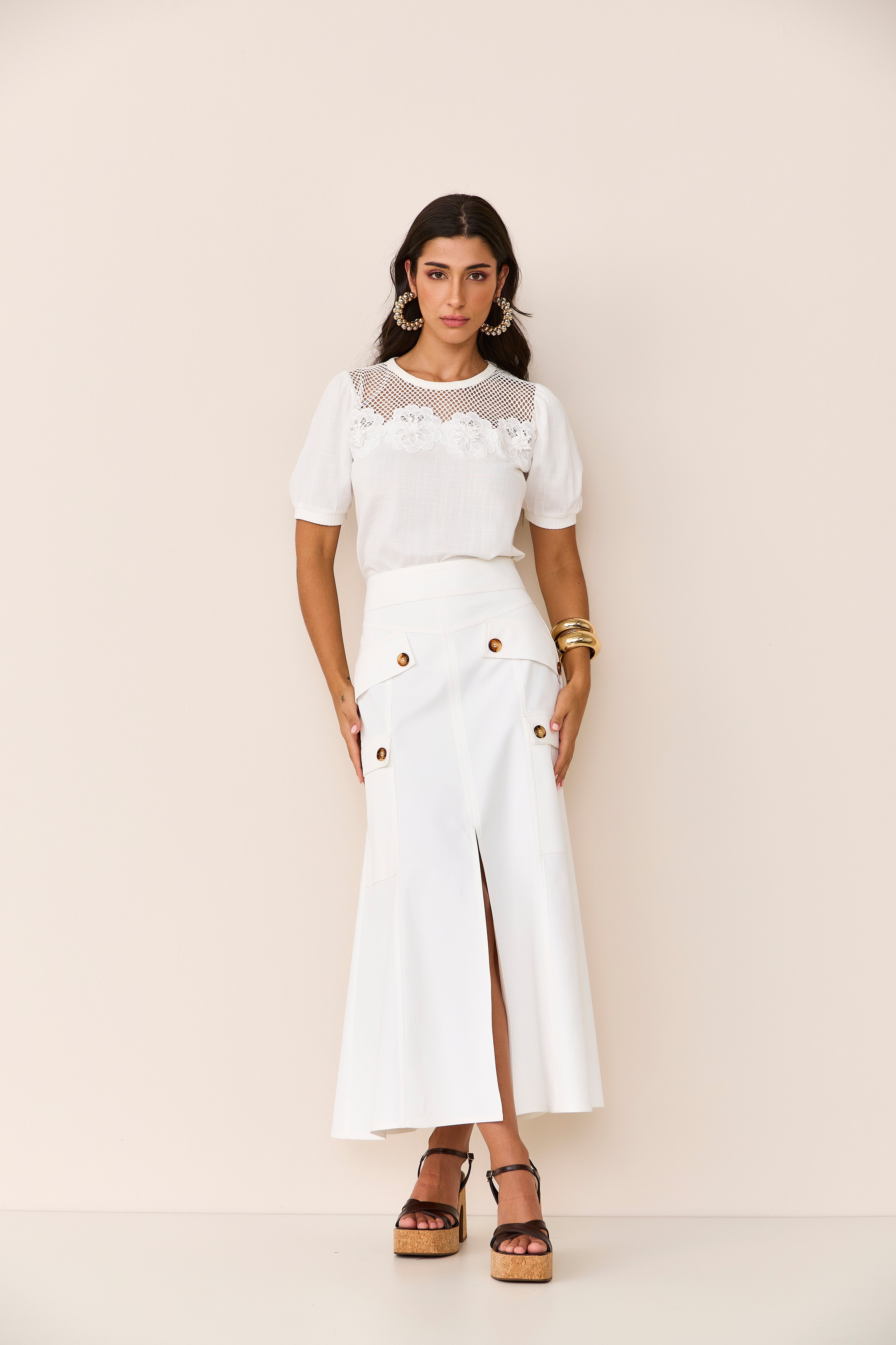 Saia midi off white com recortes modernos, bolsos frontais e botões de madeira. Uma peça super chique e versátil, que combina elegância natural e estilo atemporal.