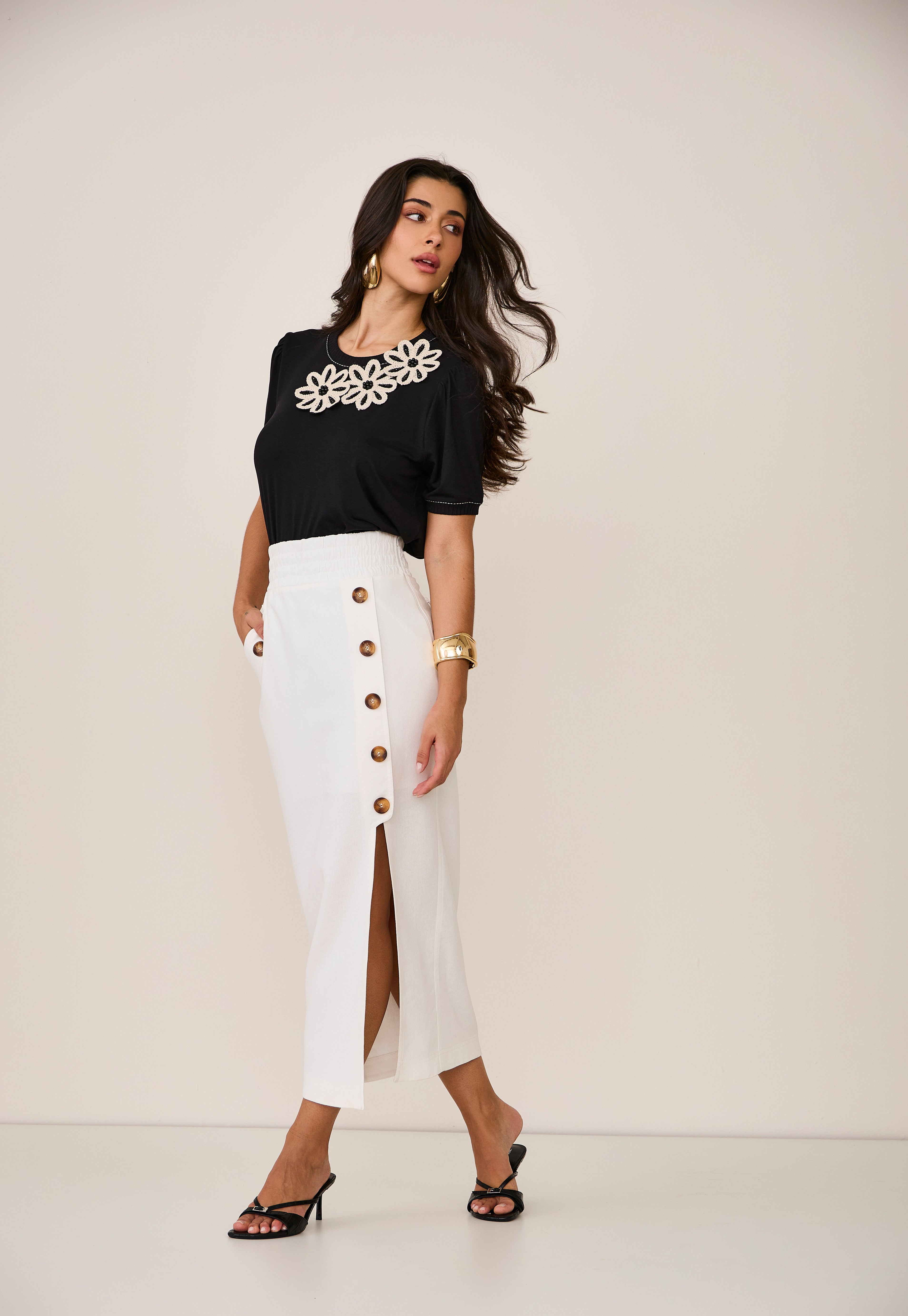 Saia Viviana — elegante e atemporal, a peça midi em tom off white se destaca pelos botões de madeira e pelo bolso lateral que adicionam charme e praticidade ao design. A fenda lateral traz um toque de leveza e movimento, resultando em uma saia sofisticada, perfeita para composições modernas e cheias de estilo.