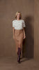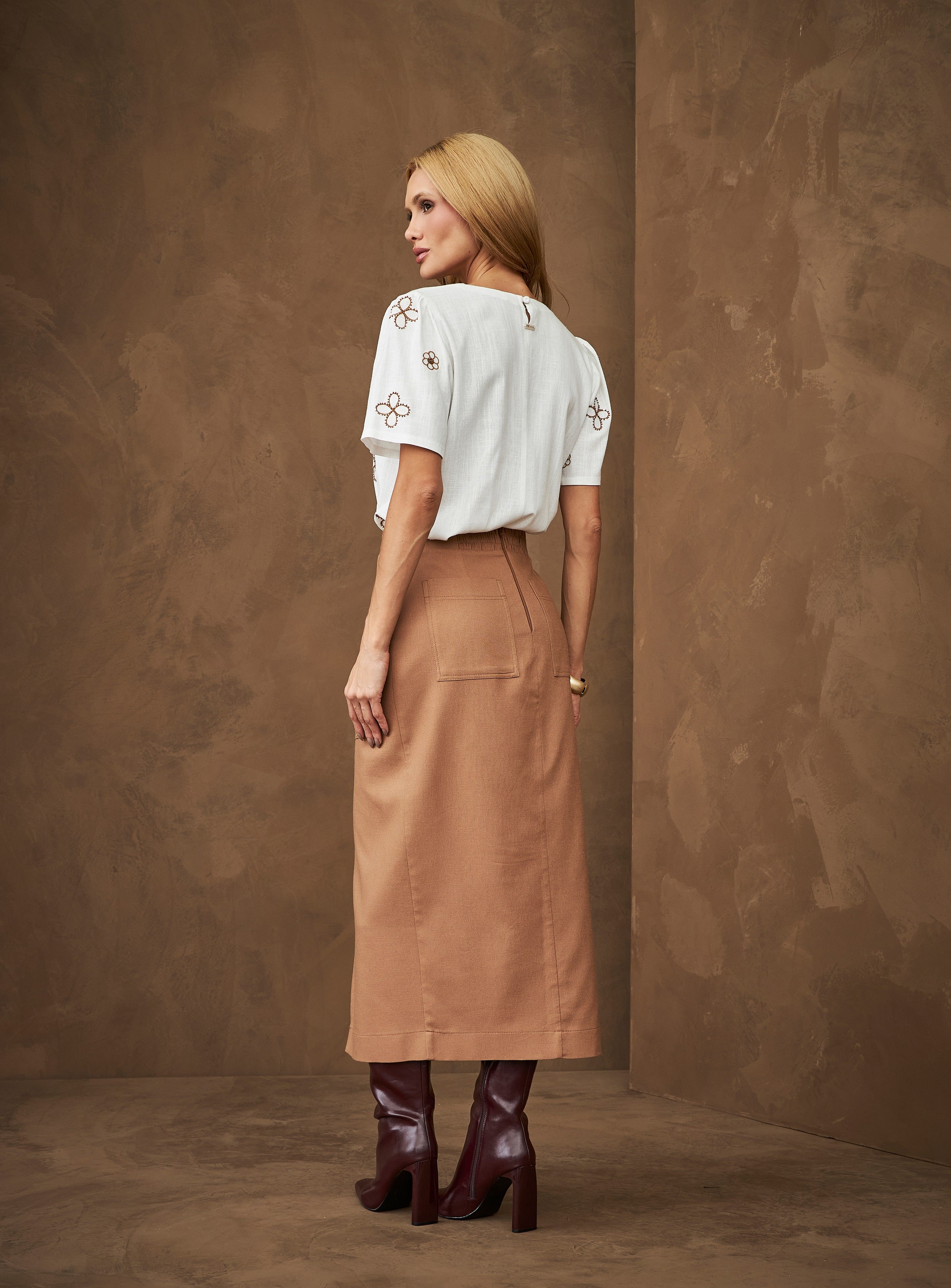 Saia midi de caimento elegante, com fenda frontal que valoriza a silhueta. Possui bolsos utilitários e detalhe de cinto que traz modernidade ao look, em um tom neutro sofisticado e versátil.