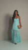 Vestido longo tomara que caia em chiffon no tom azul claro, super leve, fresco e elegante. Possui detalhes de entremeios bordados que acrescentam textura e sofisticação à peça. Um modelo delicado, perfeito para ocasiões especiais.