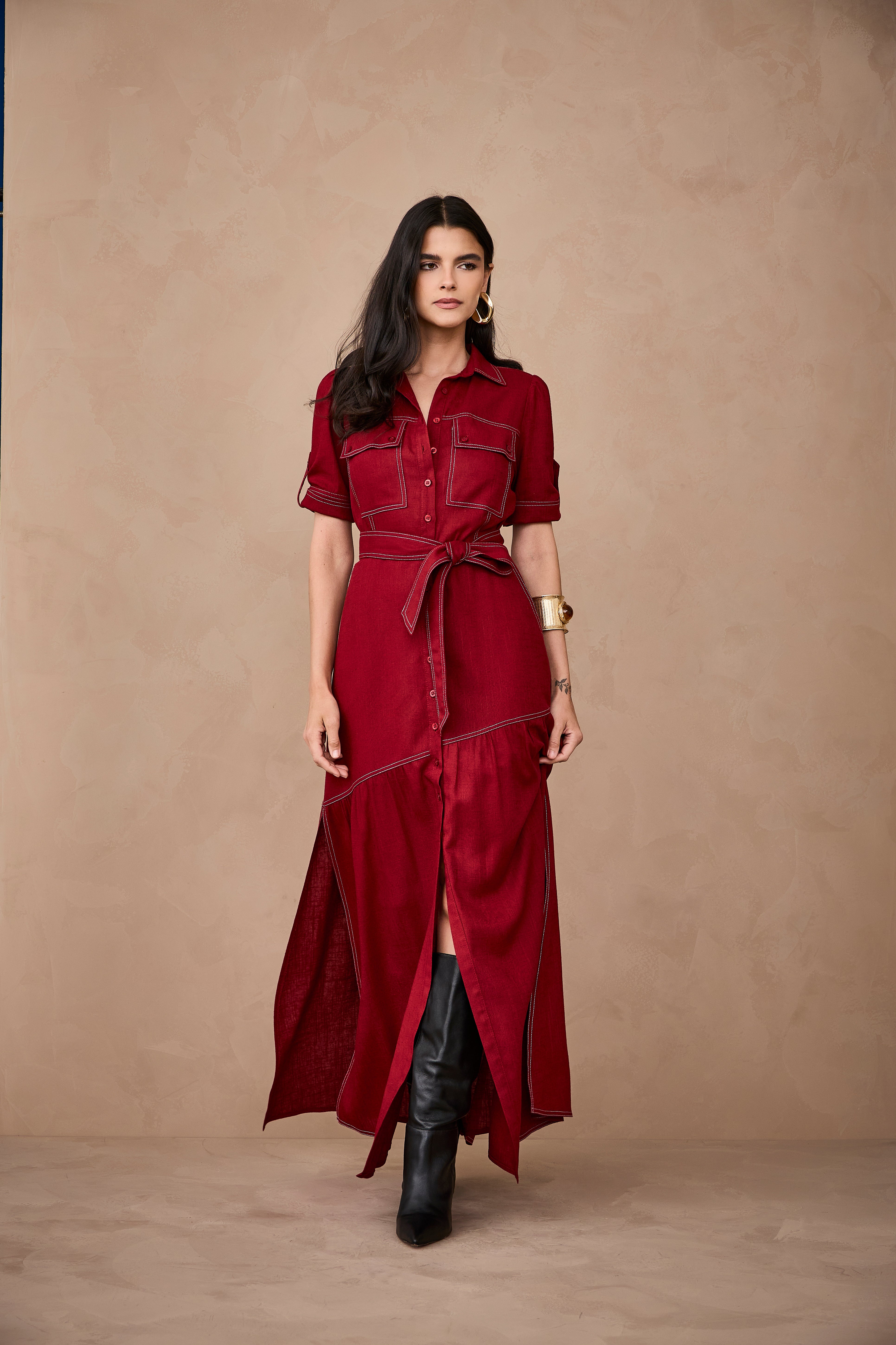 Vestido longo de mangas curtas no tom bordô, com fechamento frontal por botões, bolsos frontais funcionais e pespontos elegantes que valorizam o design. A modelagem traz sofisticação e conforto, resultando em uma peça atemporal, prática e cheia de estilo.