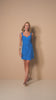 Vestido curto azul com saia transpassada, que cria um caimento elegante e moderno. Possui bordados em azul marinho na saia e nas alças, adicionando contraste e sofisticação à peça. Um modelo delicado, estiloso e cheio de charme.