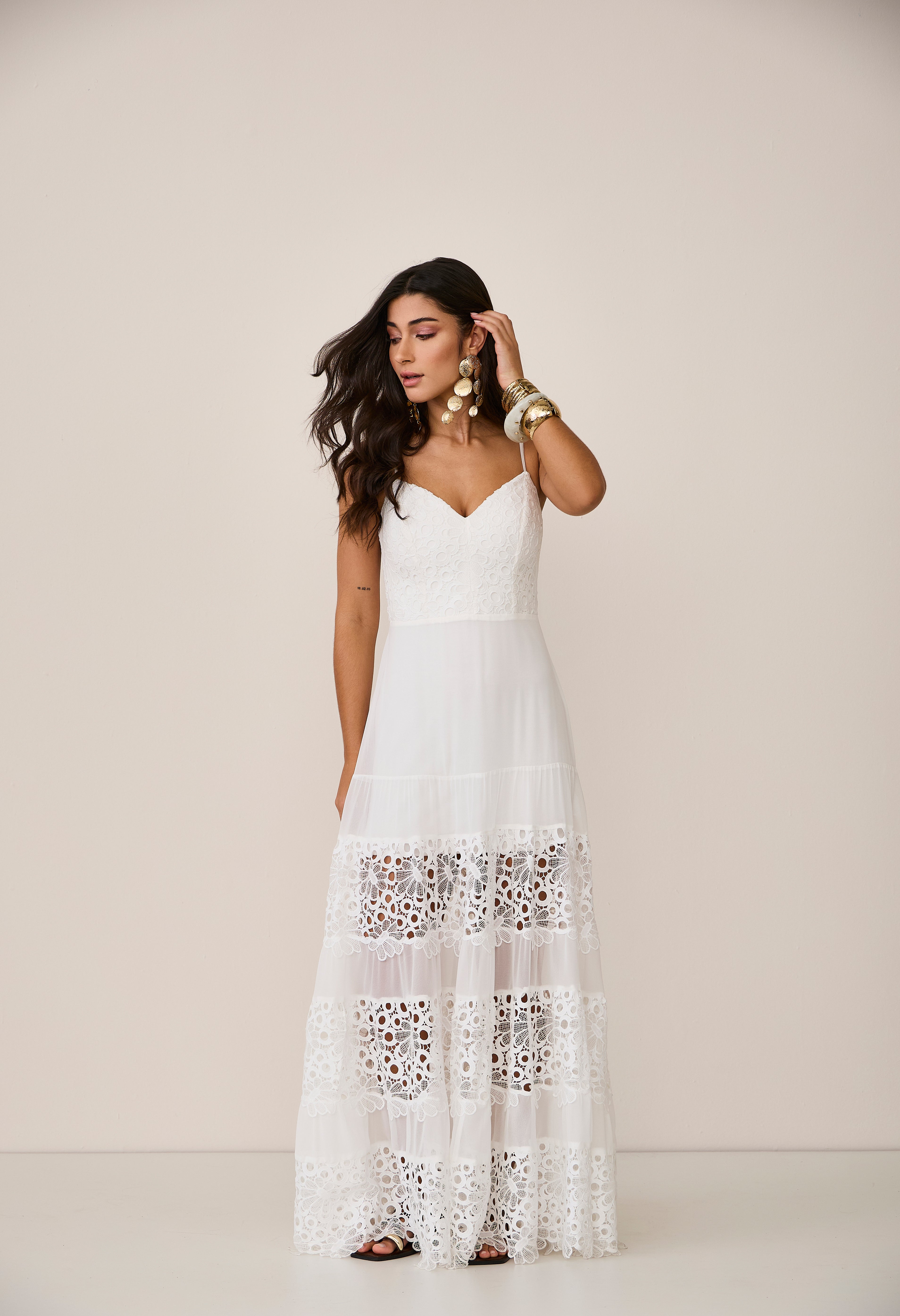 Vestido longo branco deslumbrante, feito para quem busca elegância e sofisticação em cada detalhe. Confeccionado em chiffon delicado, fluido e super leve, que envolve o corpo com movimento e graça. As alças finas valorizam o colo, enquanto os entremeios em renda adicionam um toque exclusivo de charme e delicadeza. Uma peça icônica que combina conforto e luxo, perfeita para momentos inesquecíveis.