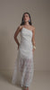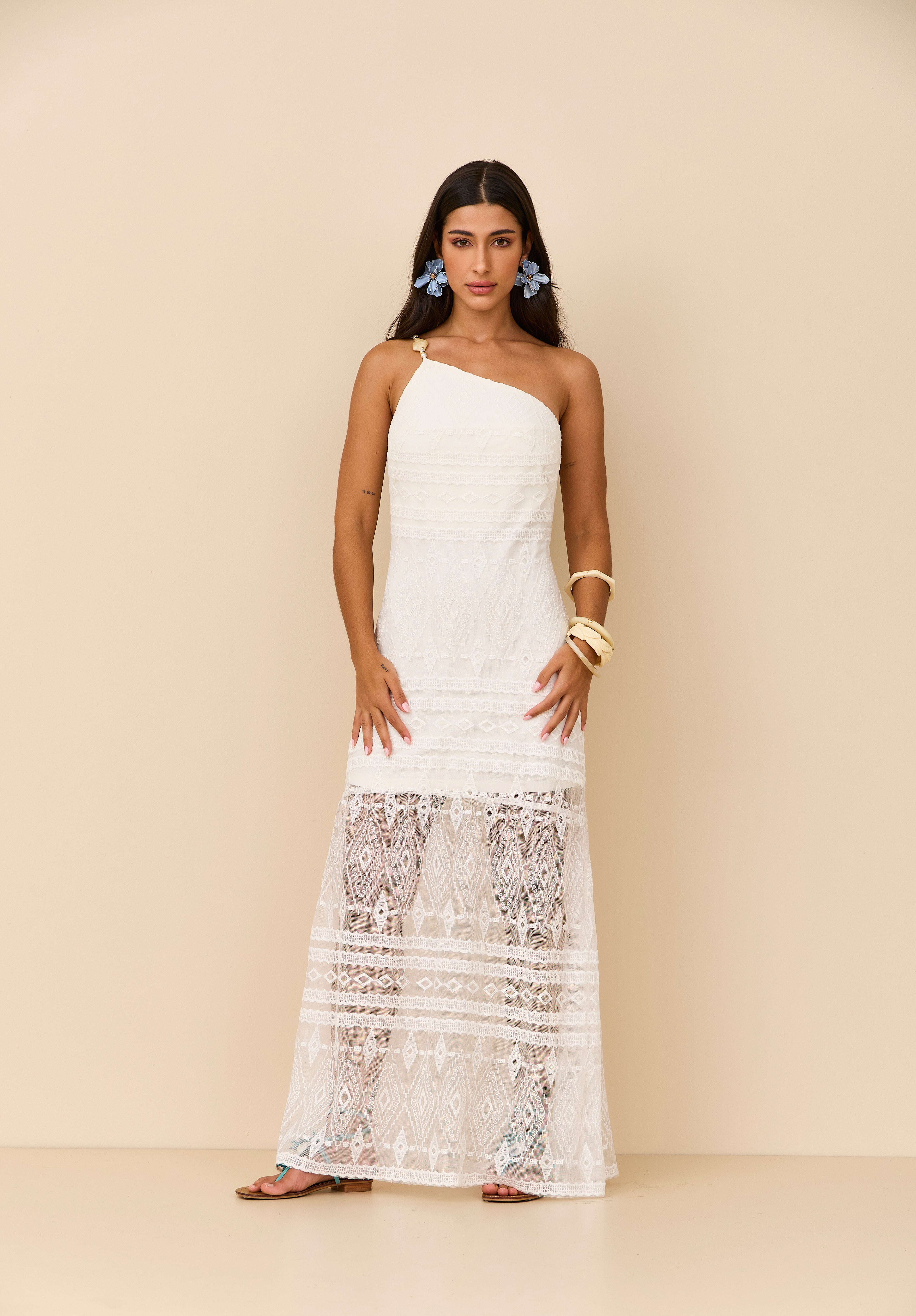 Vestido off white de um ombro só, longo e sofisticado, confeccionado em tule bordado com detalhes delicados que criam um efeito leve e elegante. O forro alcança até a altura do joelho, deixando a parte inferior transparente com muita classe e refinamento. A alça única é adornada com pedrarias que adicionam brilho sutil e um toque de glamour, tornando essa peça perfeita para ocasiões especiais que pedem presença e estilo.