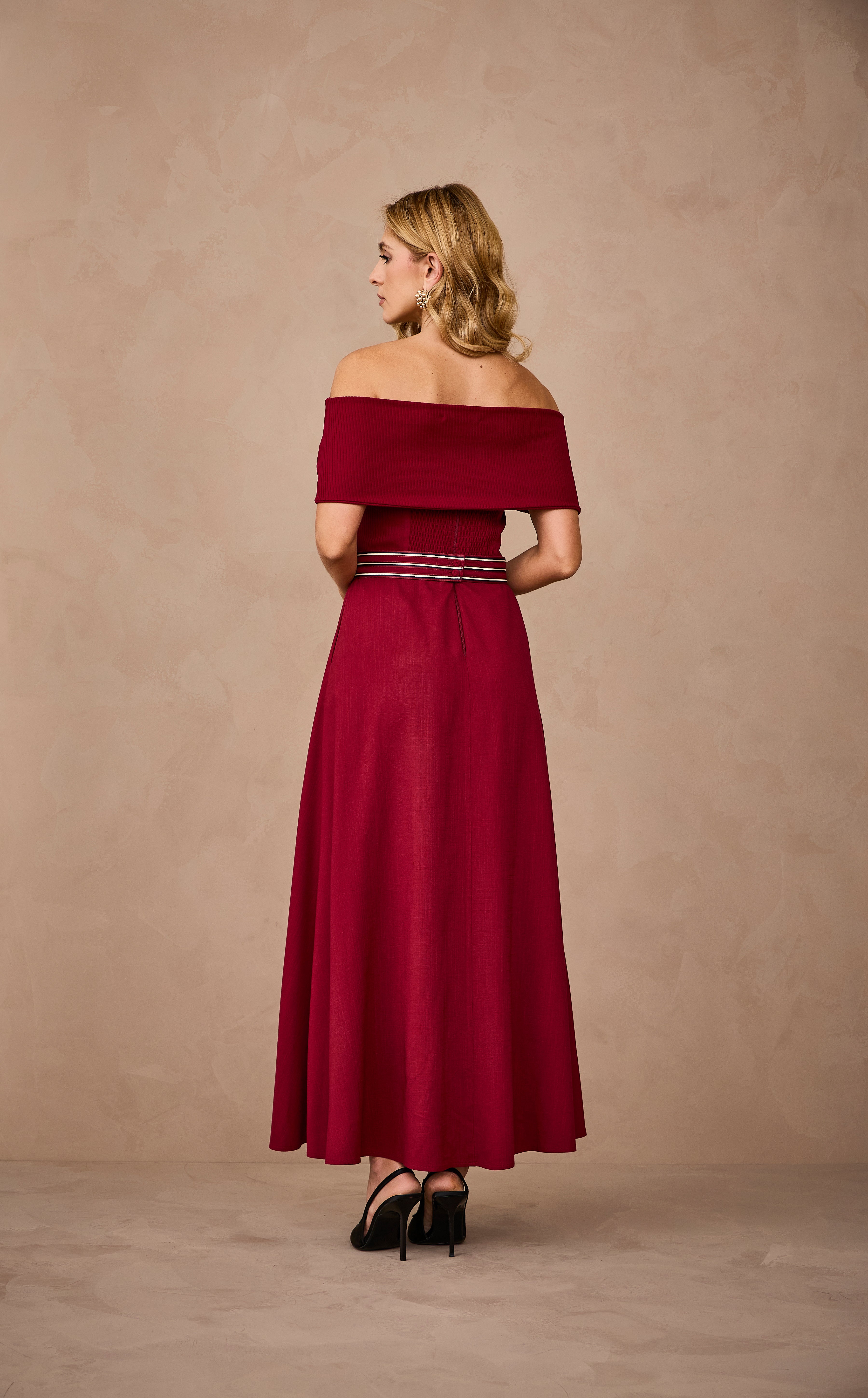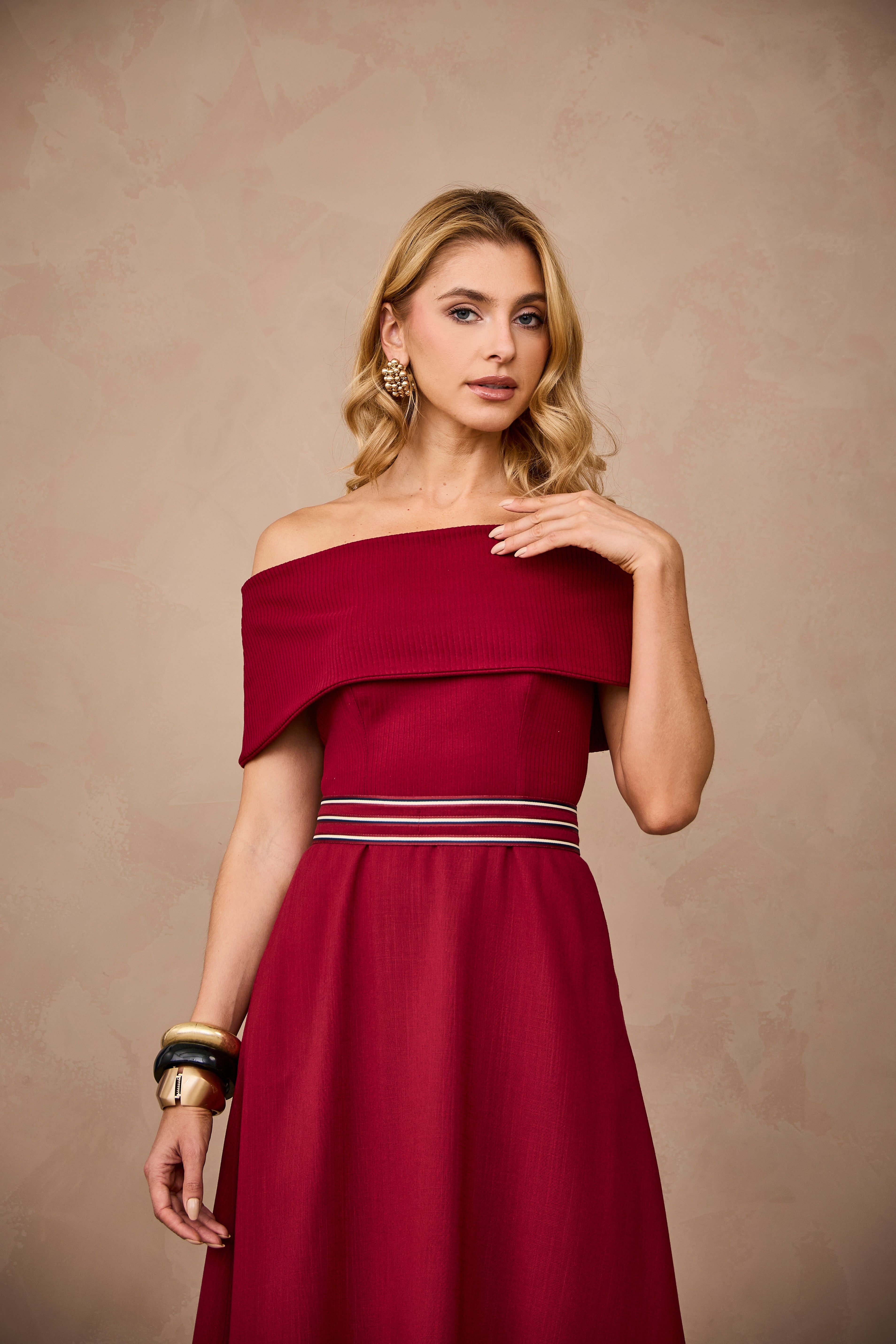 Vestido midi no tom marsala, com modelagem ampla e delicada que proporciona um visual elegante e sofisticado. Possui design ombro a ombro canelado, que acrescenta charme à peça, além de detalhe na cintura que valoriza a silhueta de forma sutil. Uma escolha refinada e cheia de personalidade.