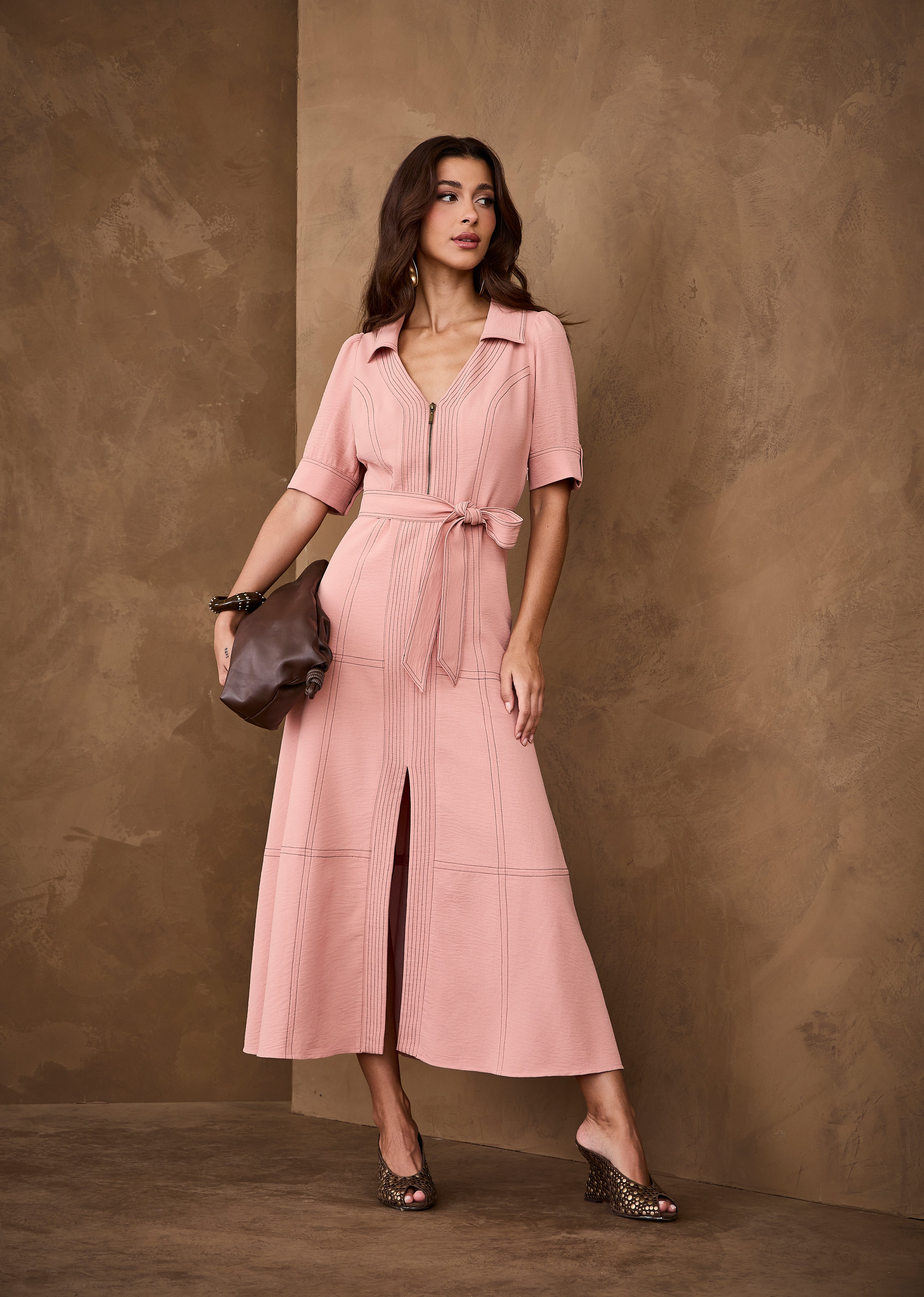 Vestido midi de mangas curtas em tom rosa delicado, com gola clássica que traz elegância e sofisticação à peça. O zíper frontal adiciona praticidade e um toque moderno, enquanto os pespontos contrastantes destacam o design com charme. Acompanha faixa para amarração, valorizando a cintura e proporcionando um caimento feminino e refinado. Um vestido versátil, perfeito para produções elegantes e atuais.